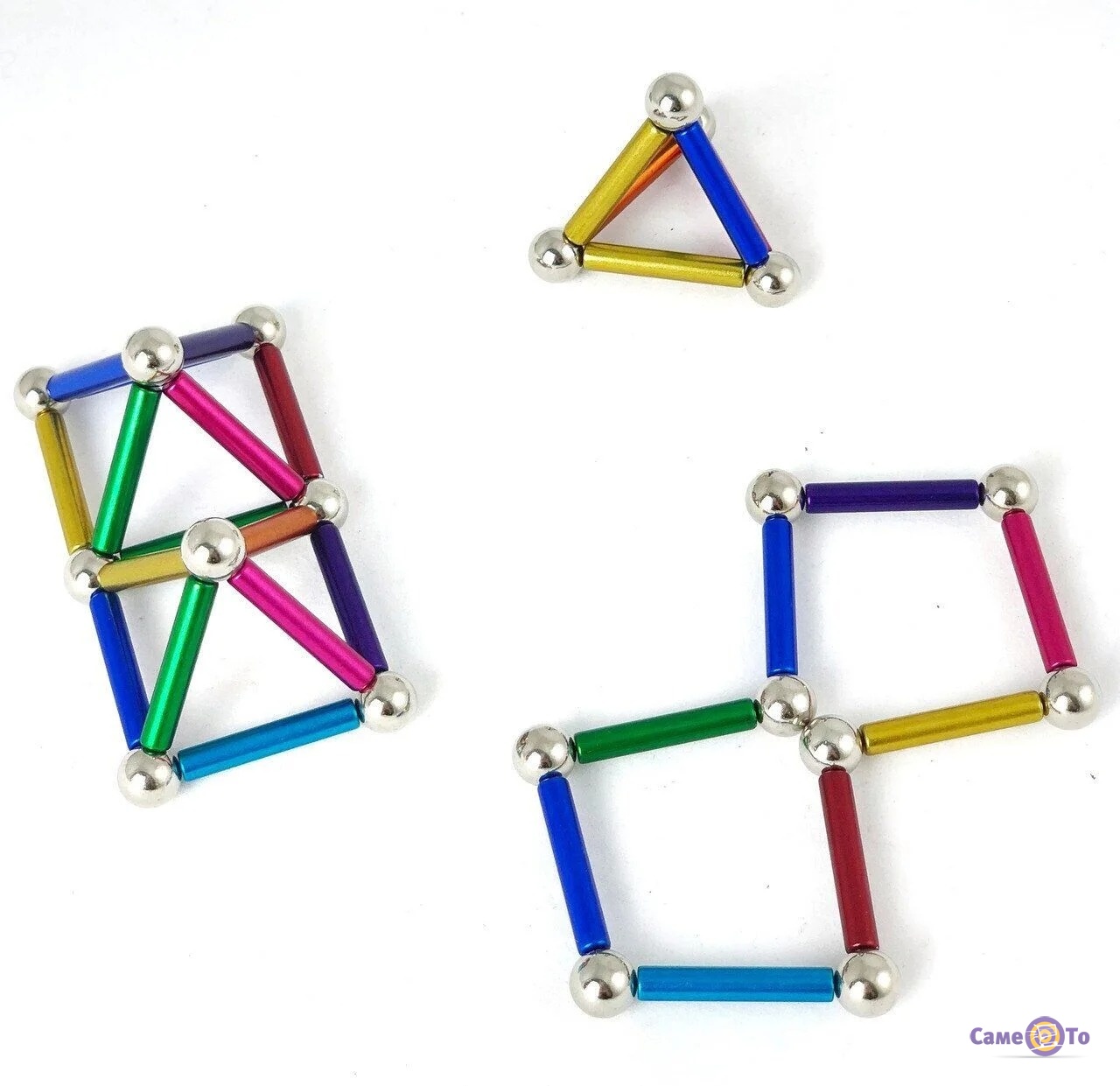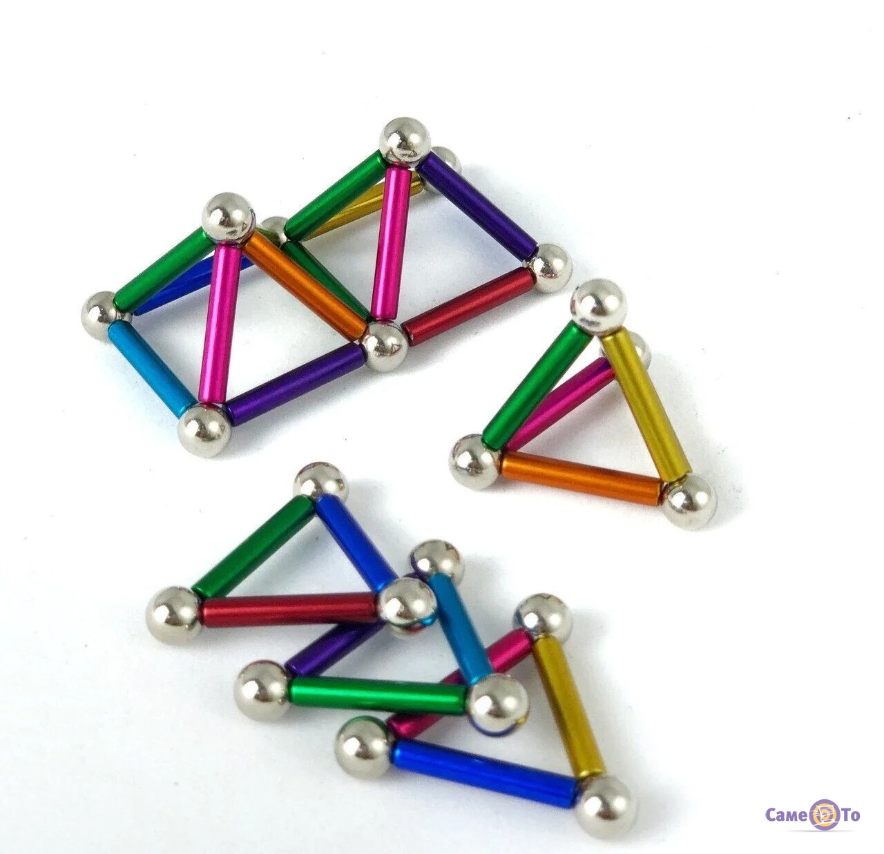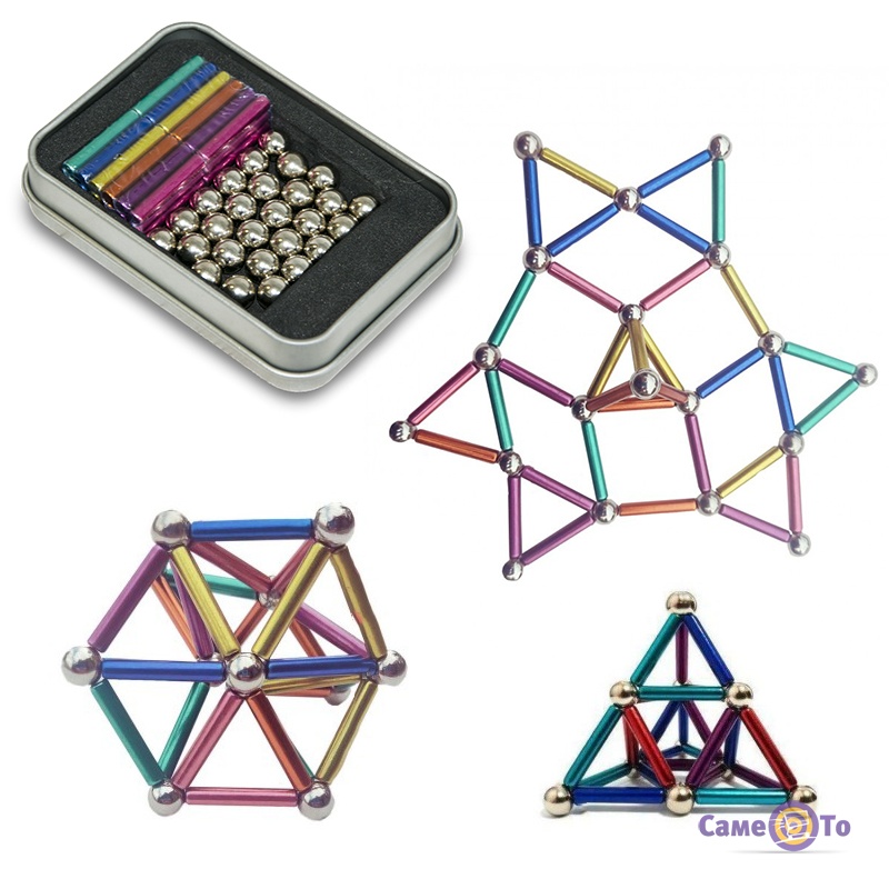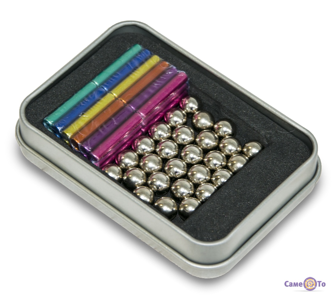 Магнітні деталі конструктора неокуба відображаються різними кольорами. Така сучасна іграшка упакована в красиву металеву коробочку. У комплекті йде 36 магнітних паличок і 24 металевих кульки. Важить комплект всього 160 гр. Його легко можна брати з собою в дорогу для гри в поїзді.