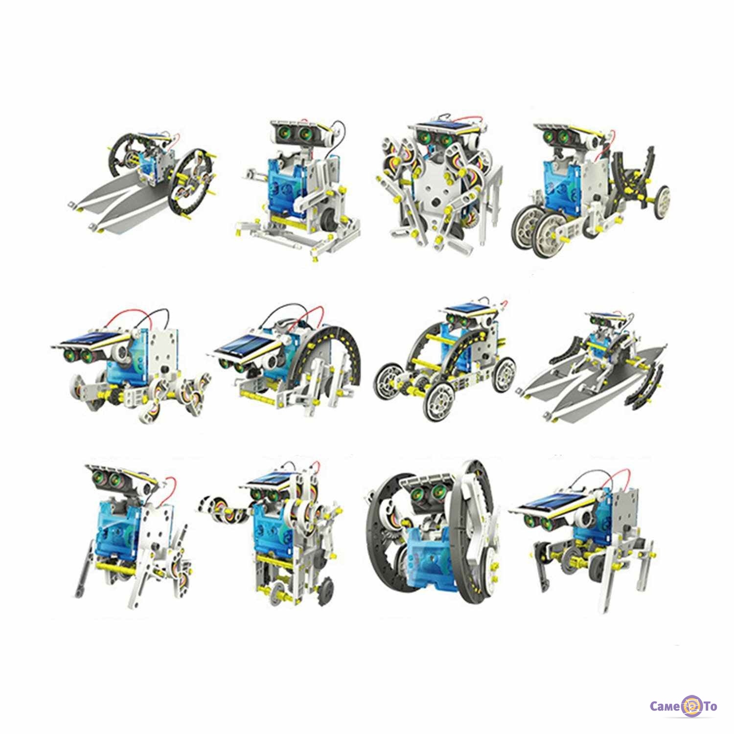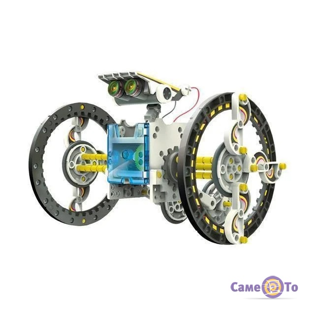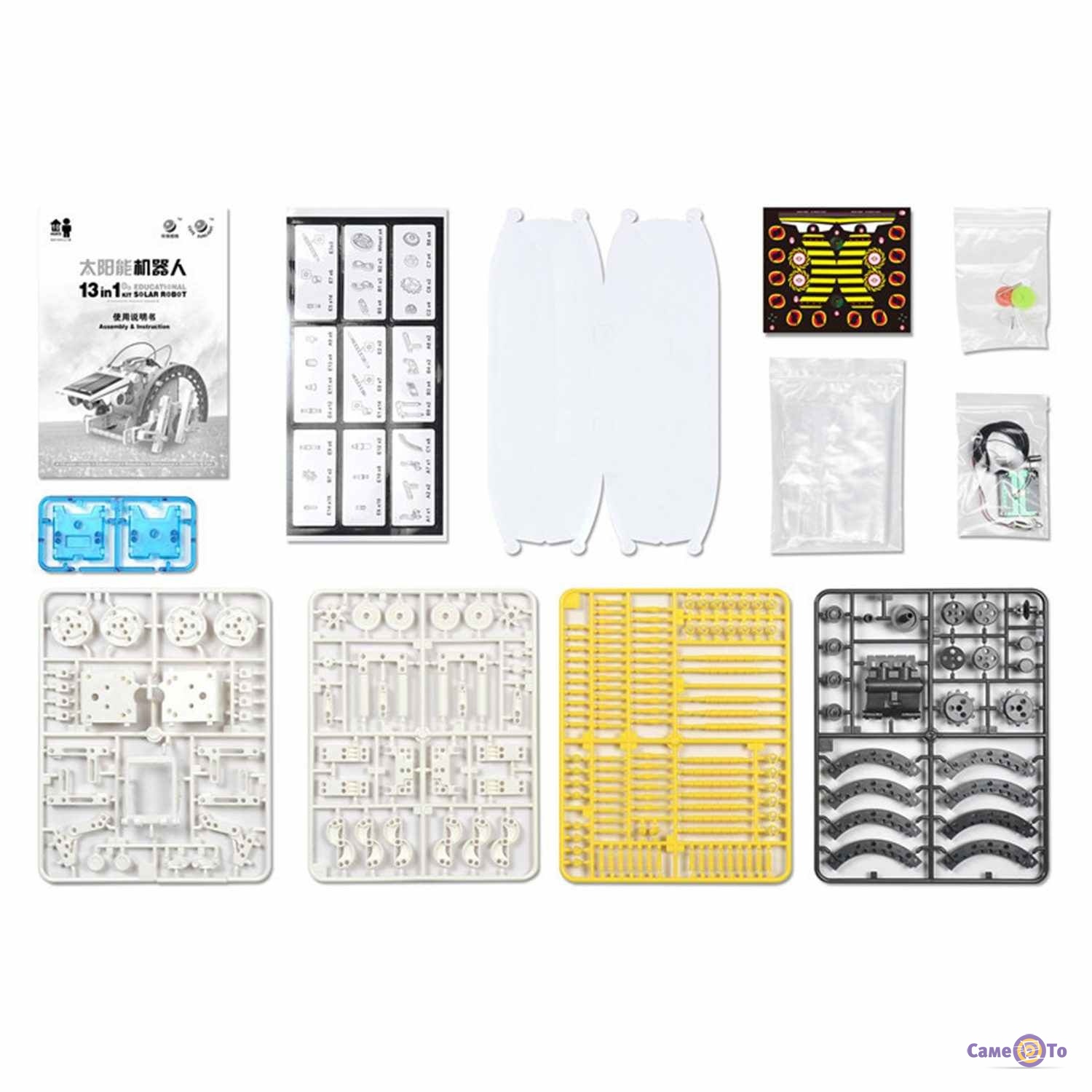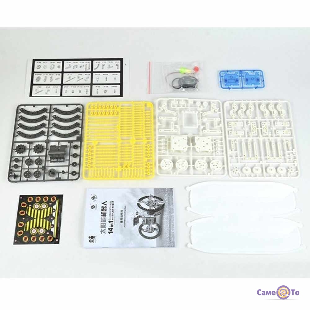 Конструктор Solar Robot передбачає складання 13 моделей. У комплекті є двигун і спеціальні елементи, які забезпечують роботу модельки на суші і в воді. Полярність сонячної батареї регулюється, щоб можна було міняти напрямку обертання двигуна. А прозорий корпус двигуна забезпечує спостереження за його роботою.