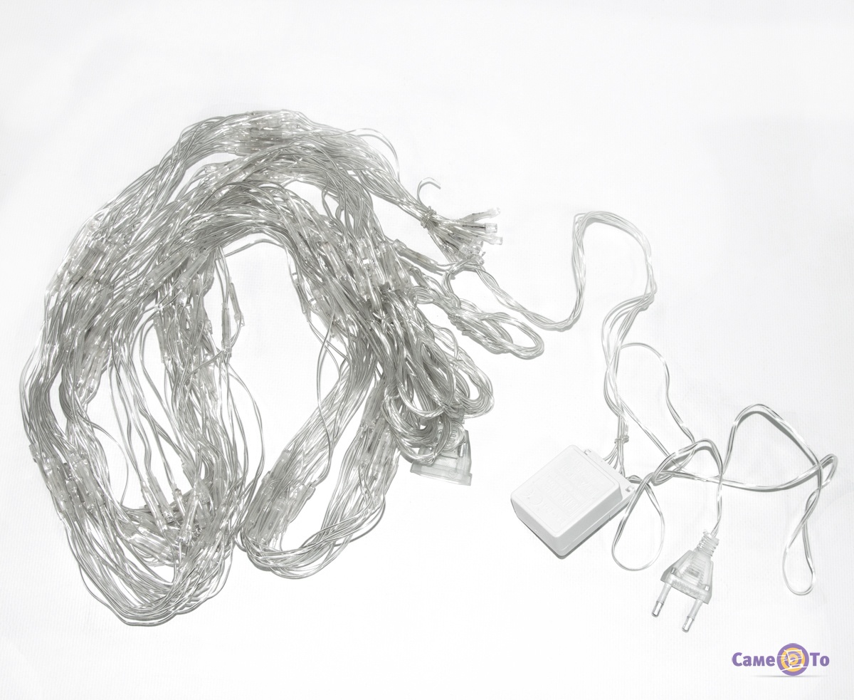 Світлодіодна сітка складається з 120 LED-лампочок з білим холодним світінням та працює від електромережі. Виріб оснащений контролером для перемикання режимів, серед яких: миготіння, згасання та ін. Завдяки наявності спеціального перехідника можливе поєднання декількох пристроїв в одну велику прикрасу.