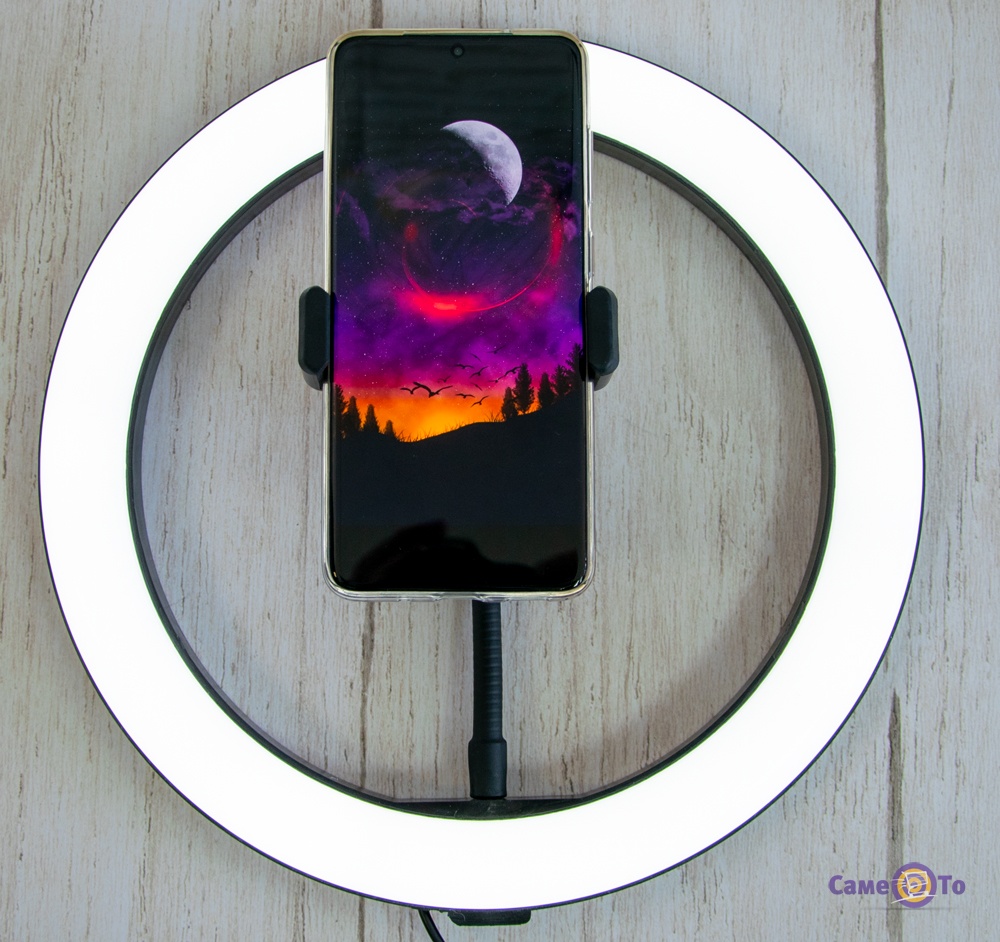 Вона створює додаткове світло під час фотозйомки. Селфі-лампа з тримачем для телефону кріпиться на кронштейні, який в процесі фотозйомки може пересуватися і регулювати становище камери, створюючи необхідний ефект освітлення. Лампа має три світлових режиму. Селфі кільце може обертатися на 180 градусів за рахунок рухомих елементів кріплення, що гарантує повноцінний функціонал використання. Пристрій має компактні розміри, що дозволяє брати його на виїзні зйомки. Світлодіодне кільце на штативі дає більший ракурс фото, за рахунок високого розміщення. Цей телефон з якісних матеріалів, що сприяє тривалому використанню лампи.