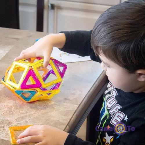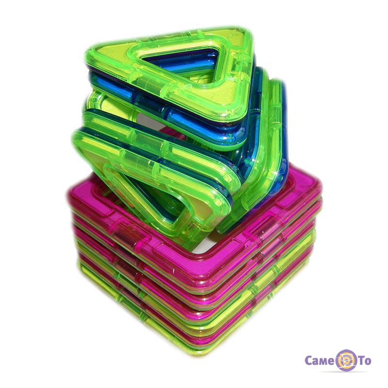 По-перше, набір включає в себе елементи в формі геометричних фігур - трикутника, квадрата. По-друге, всі деталі легко фіксуються один з одним завдяки силі тяжіння магнітів. Таким чином, дитина в ігровій формі навчиться відрізняти один від одного найголовніші геометричні фігури і на особистому досвіді досліджує силу тяжіння.