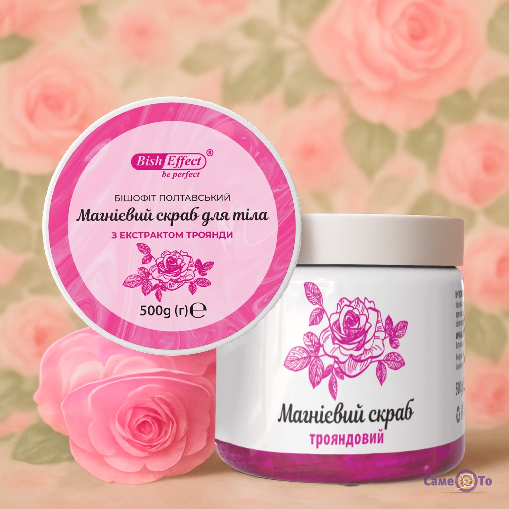 Магнієвий скраб для тіла з полтавським бішофітом і трояндою 500 г - гладка шкіра, антицелюлітний ефект
