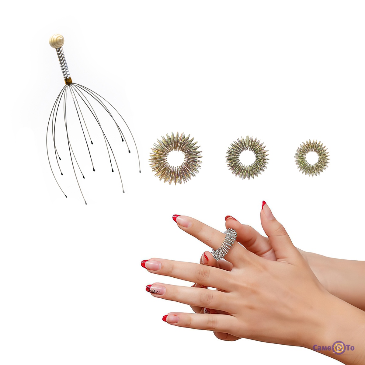Головною особливістю цього набору є потрійні масажні кільця для пальців, створені за методикою Су Джок – стародавньої традиційної медицини, яка приділяє особливу увагу точкам на пальцях. Просто надягніть ці кільця на пальці і почніть обертати їх, відчуваючи приємний масаж тиск на біологічно активні точки. Цей масаж допомагає зняти напругу, усунути біль та покращити загальне самопочуття.