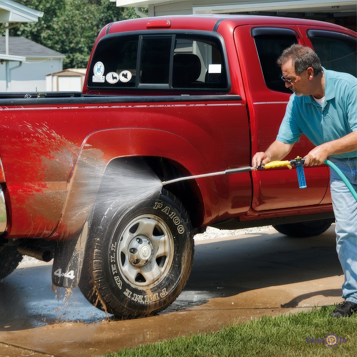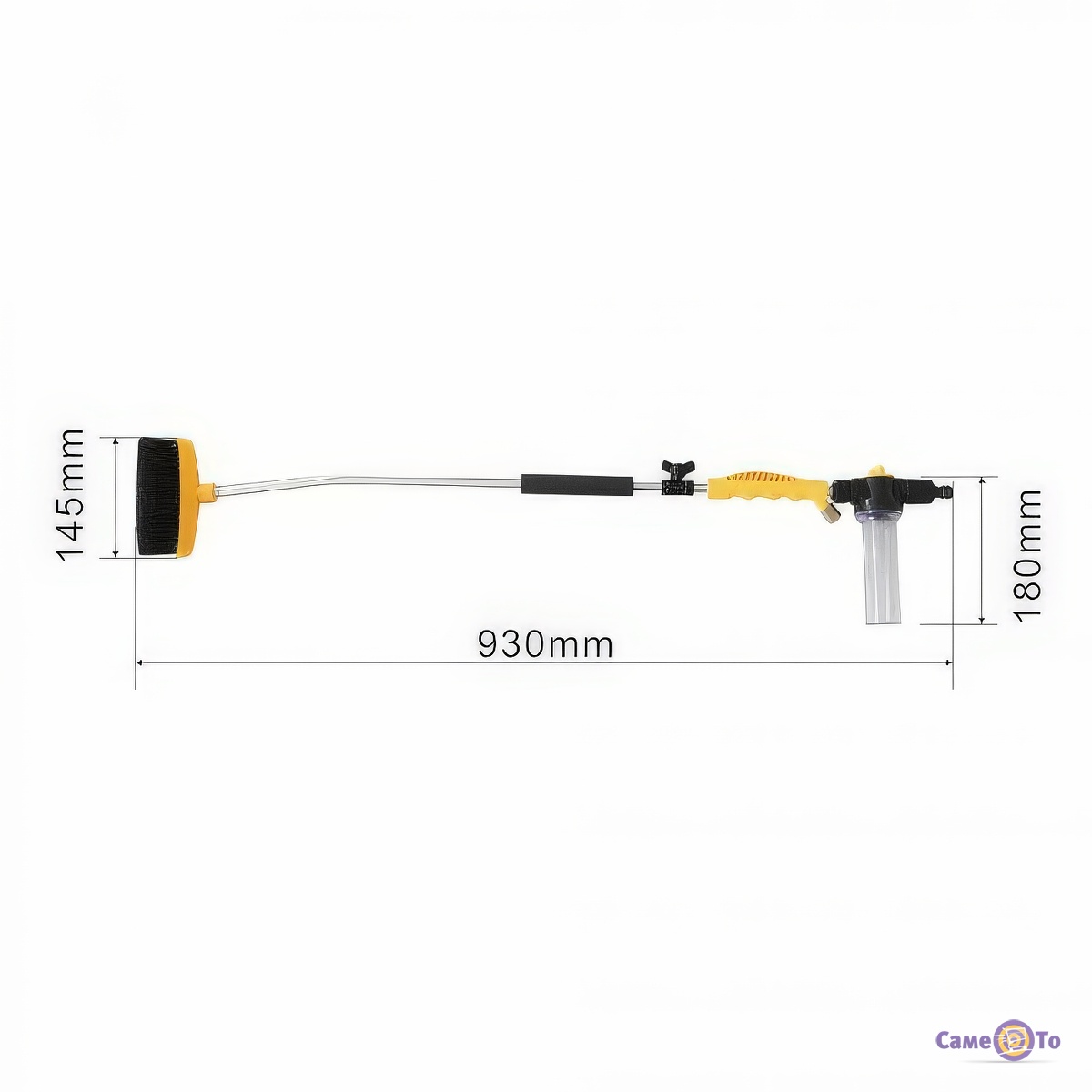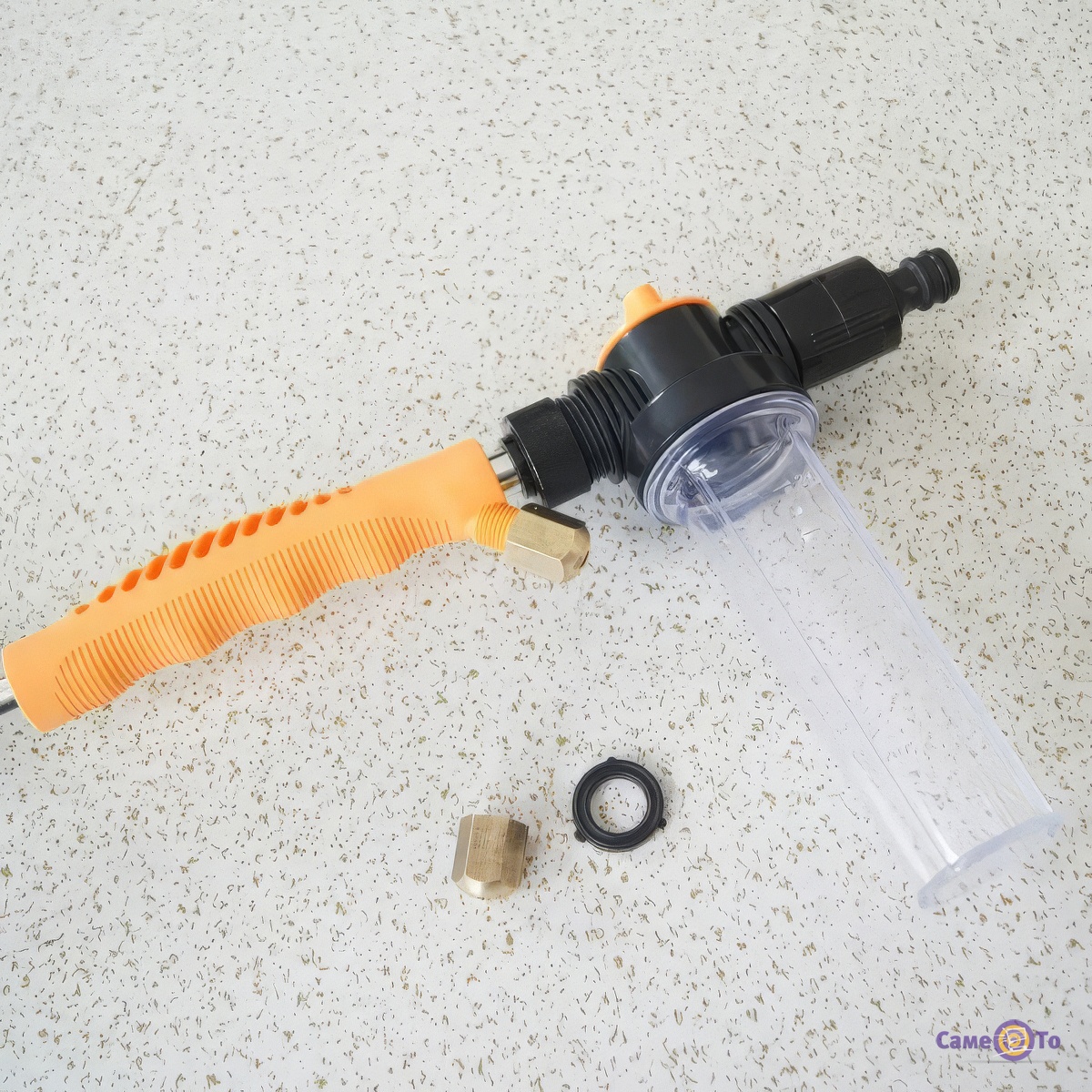 У комплект пристрою входить перехідник для шланга з кільцем ущільнювача, кульовий вентиль, а також дві спеціальні насадки з різним типом подачі води. Перша створює вузький щільний струмінь, який дозволяє ефективно змити забруднення, сконцентроване у важкодоступному місці. Друга - пульверизатор, що розбризкує воду у вигляді фонтану солідного радіусу. З її допомогою зручно змивати пил з великих плоских горизонтальних і вертикальних поверхонь. У комплекті передбачена невелика місткість для миючого засобу з регулятором подачі і пінним запобіжником. Для видалення бруду, що в'ївся виробником передбачена щітка, яка кріпиться на спеціальну ручку і дозволяє розправитися навіть з забрудненням досить великого терміну давності .