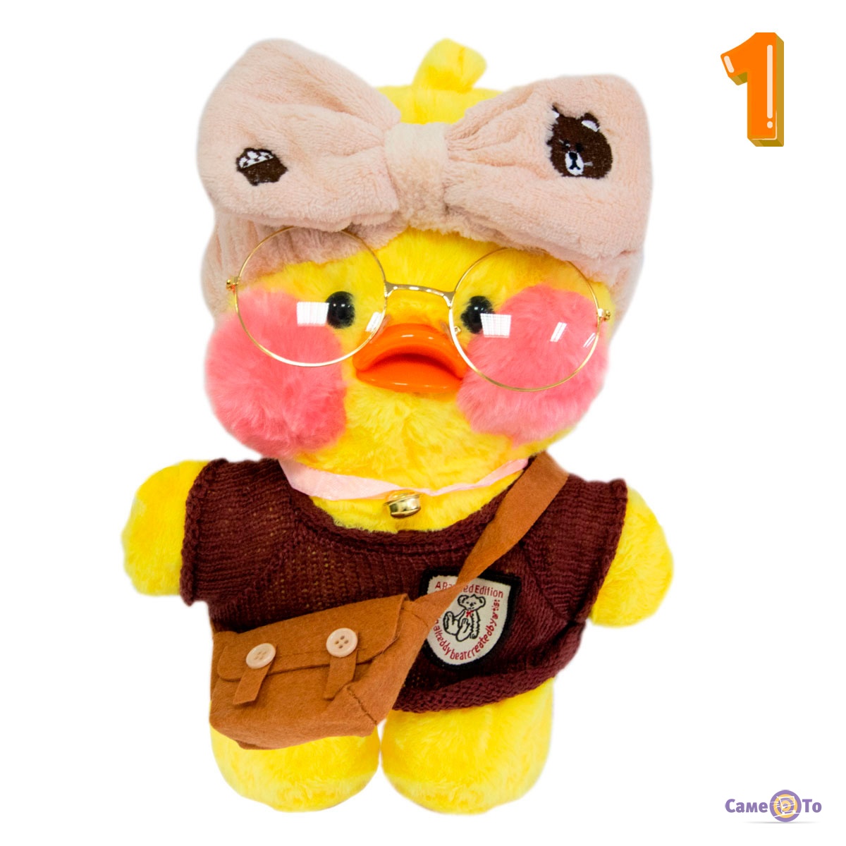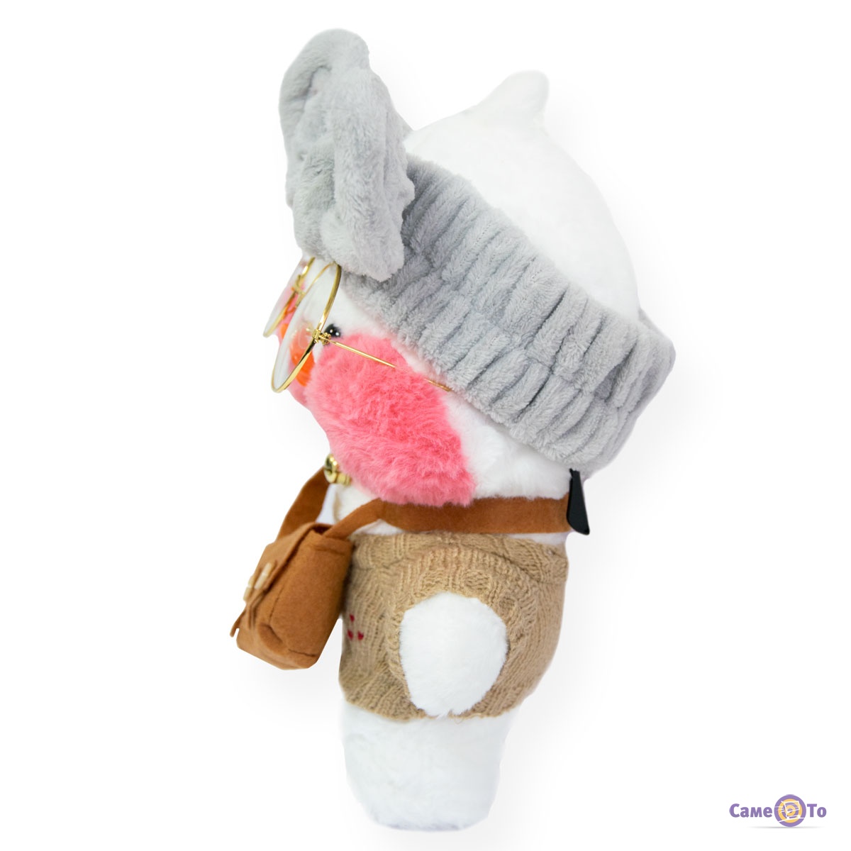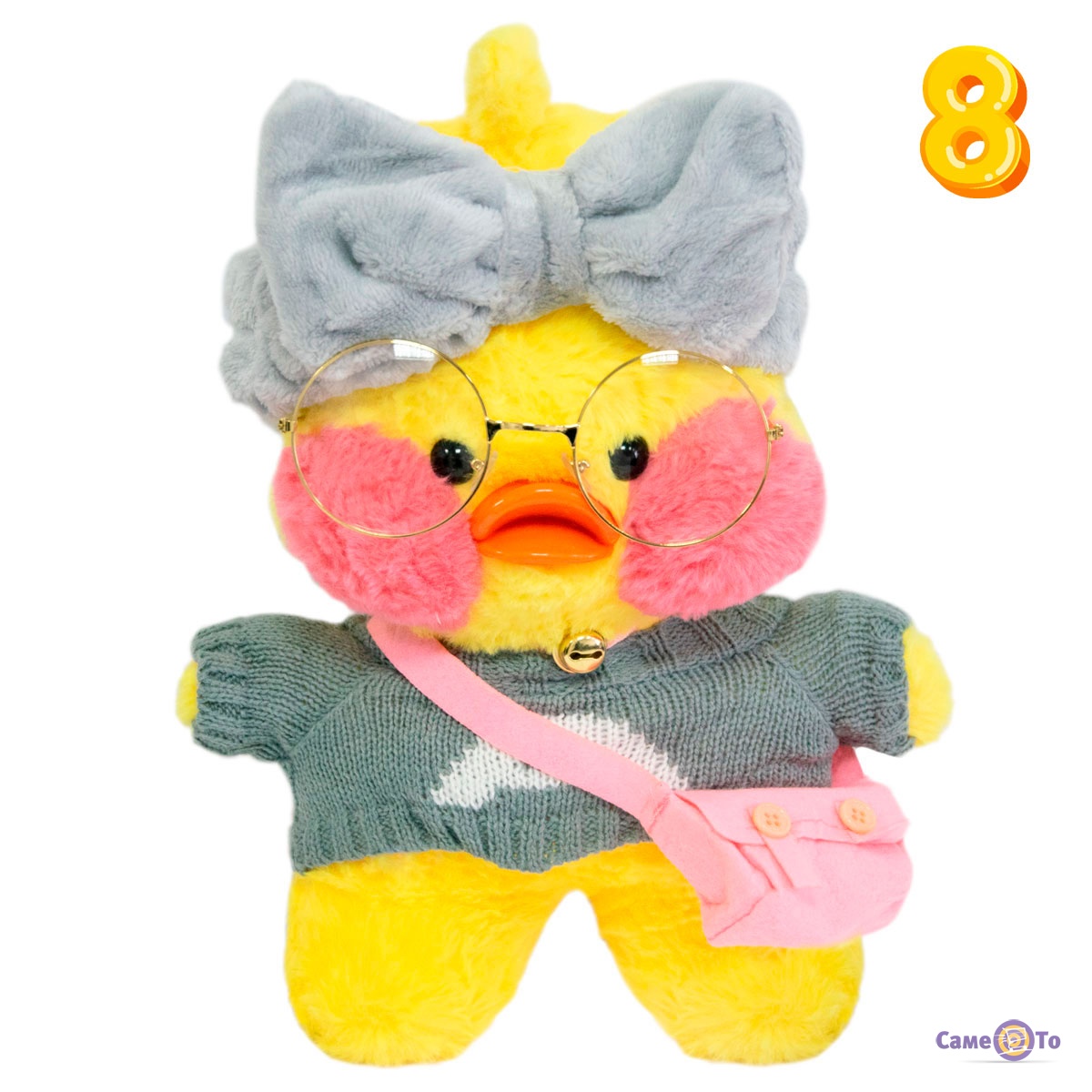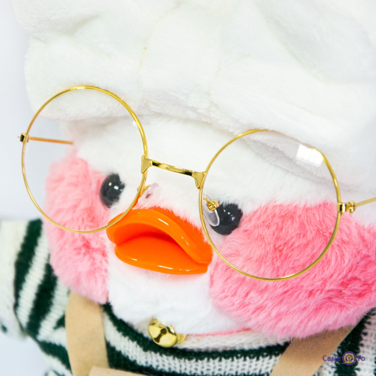 Уточка с очками сделана из плюша высокого качества, который приятен на ощупь и мягкий. Основу наполнителя составляет легкий синтепух, поэтому вес утенка всего 200 грамм. Оранжевый клюв игрушки выполнен из пластика. Высота с учетом хохолка составляет 30 сантиметров, в наборе с утенком представлена милая миниатюрная одежда и аксессуары.