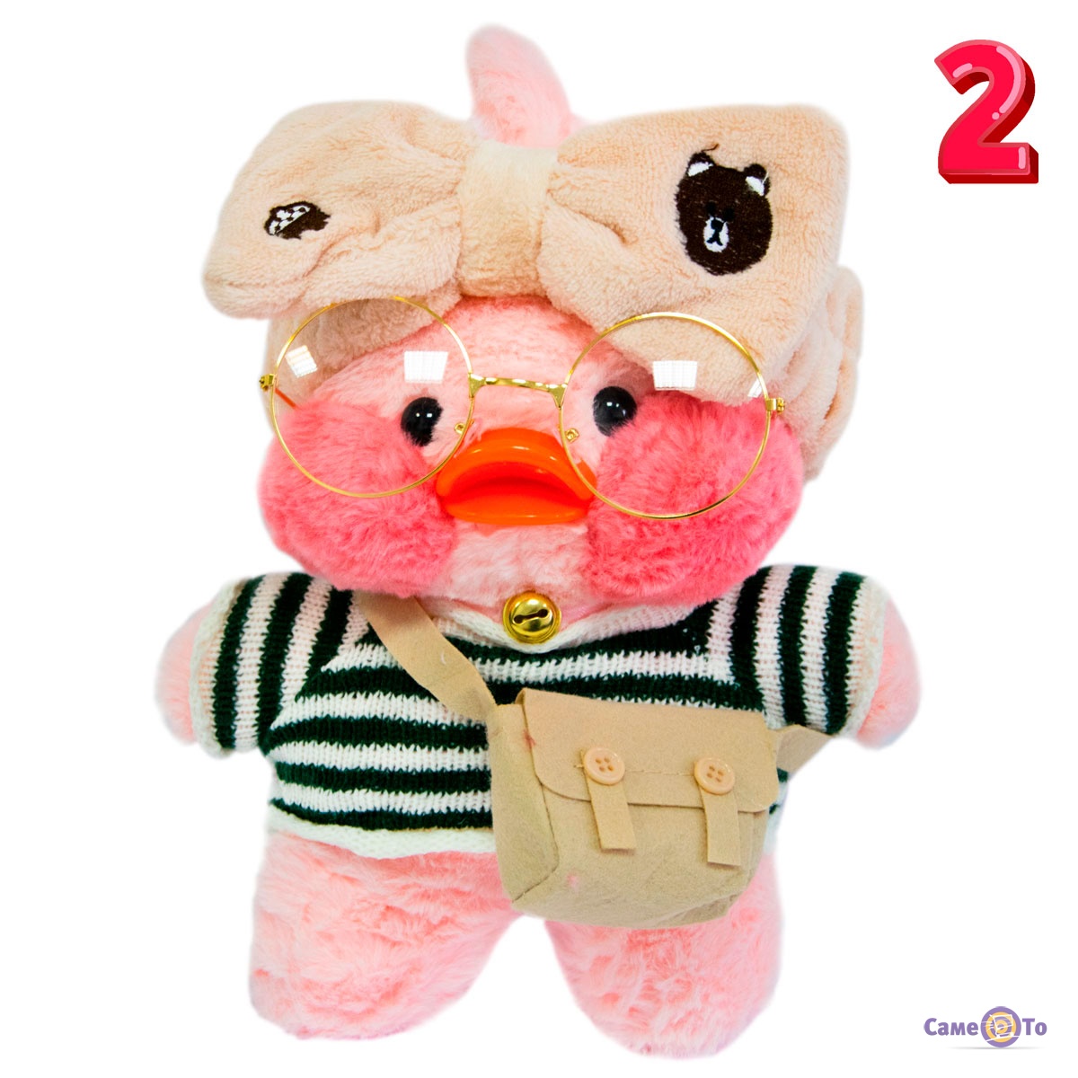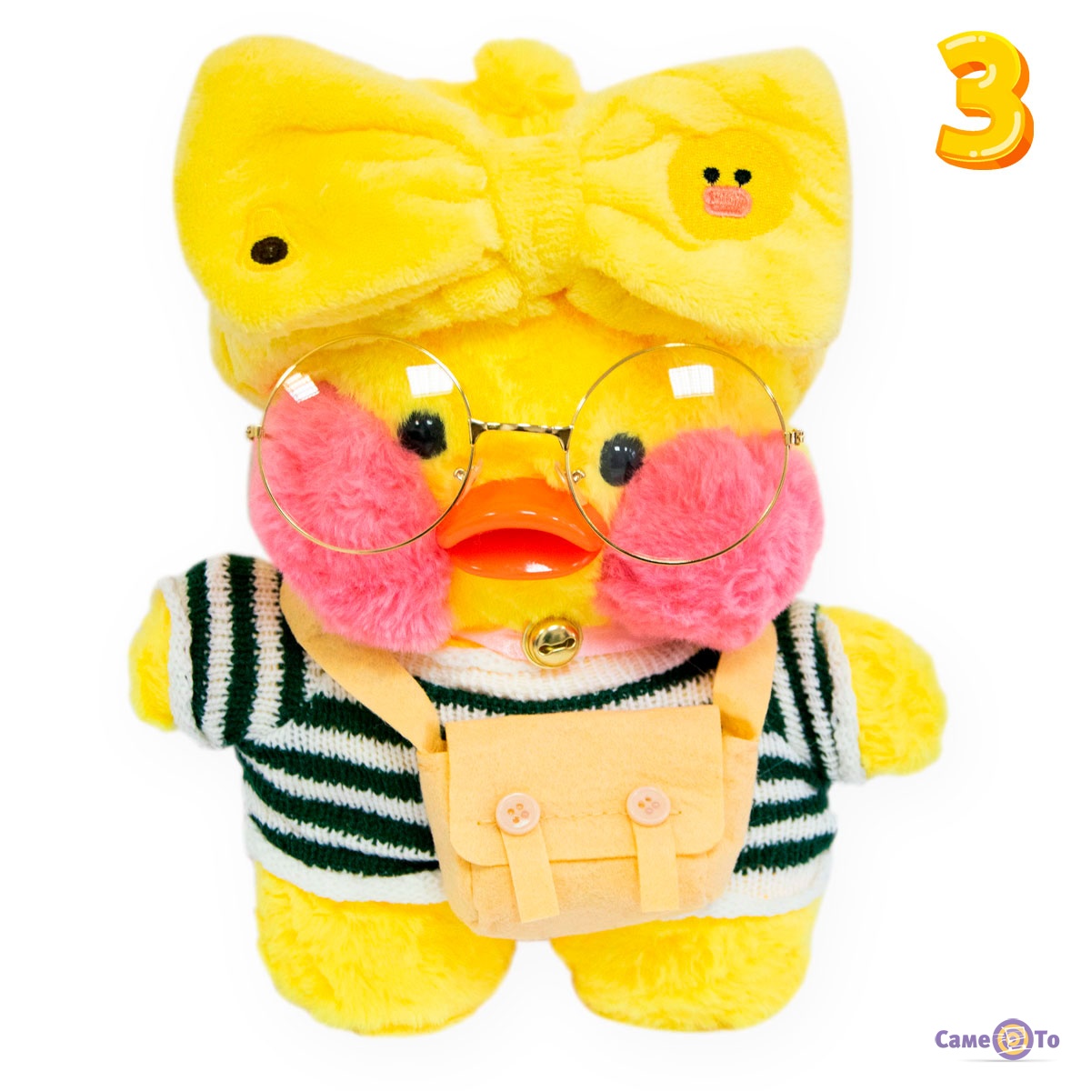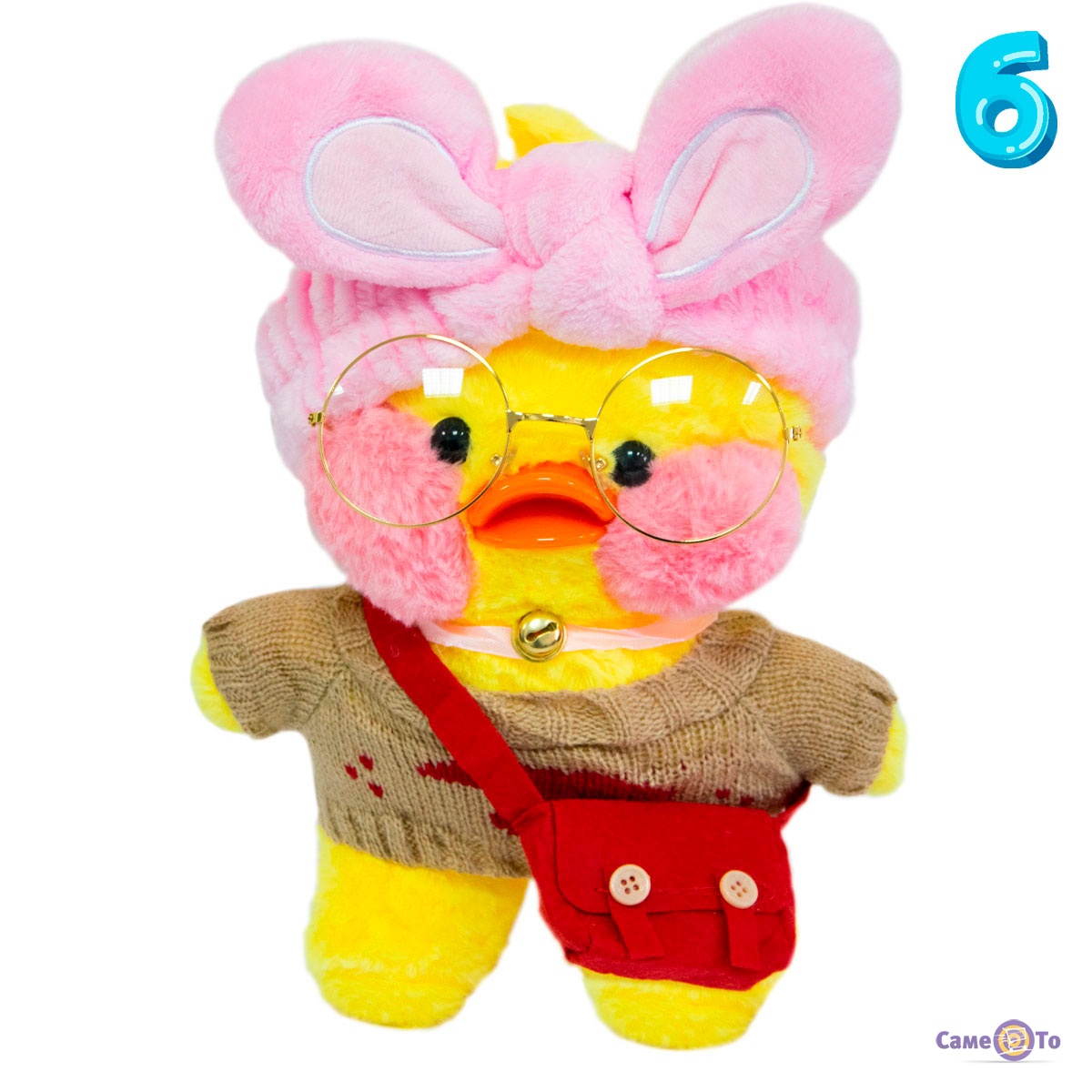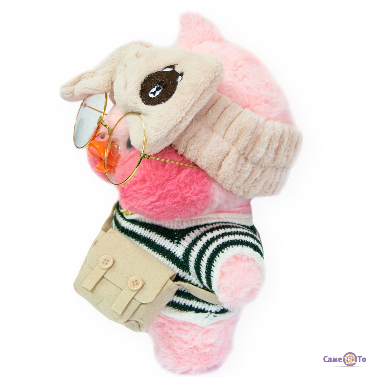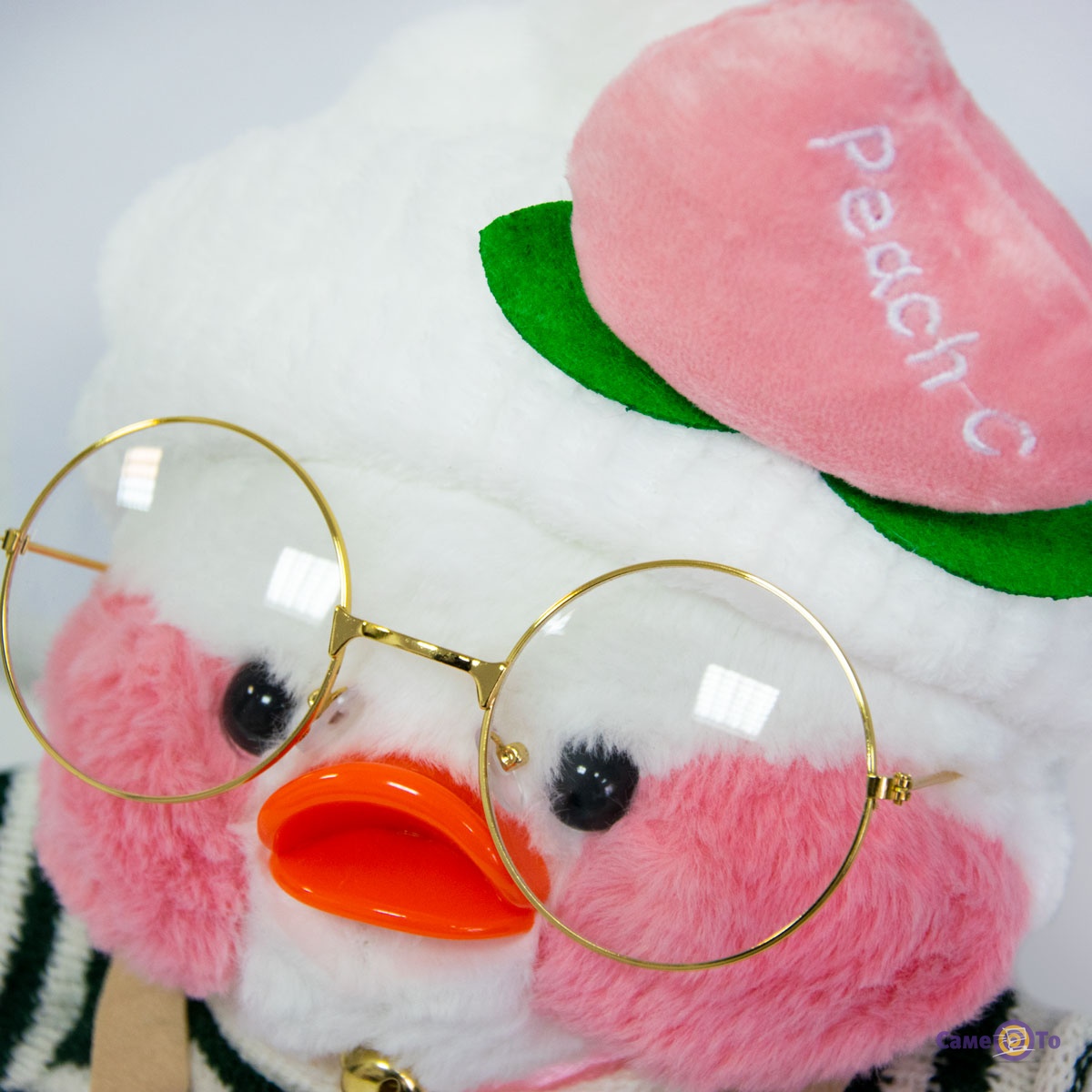 Уточка с очками сделана из плюша высокого качества, который приятен на ощупь и мягкий. Основу наполнителя составляет легкий синтепух, поэтому вес утенка всего 200 грамм. Оранжевый клюв игрушки выполнен из пластика. Высота с учетом хохолка составляет 30 сантиметров, в наборе с утенком представлена милая миниатюрная одежда и аксессуары.