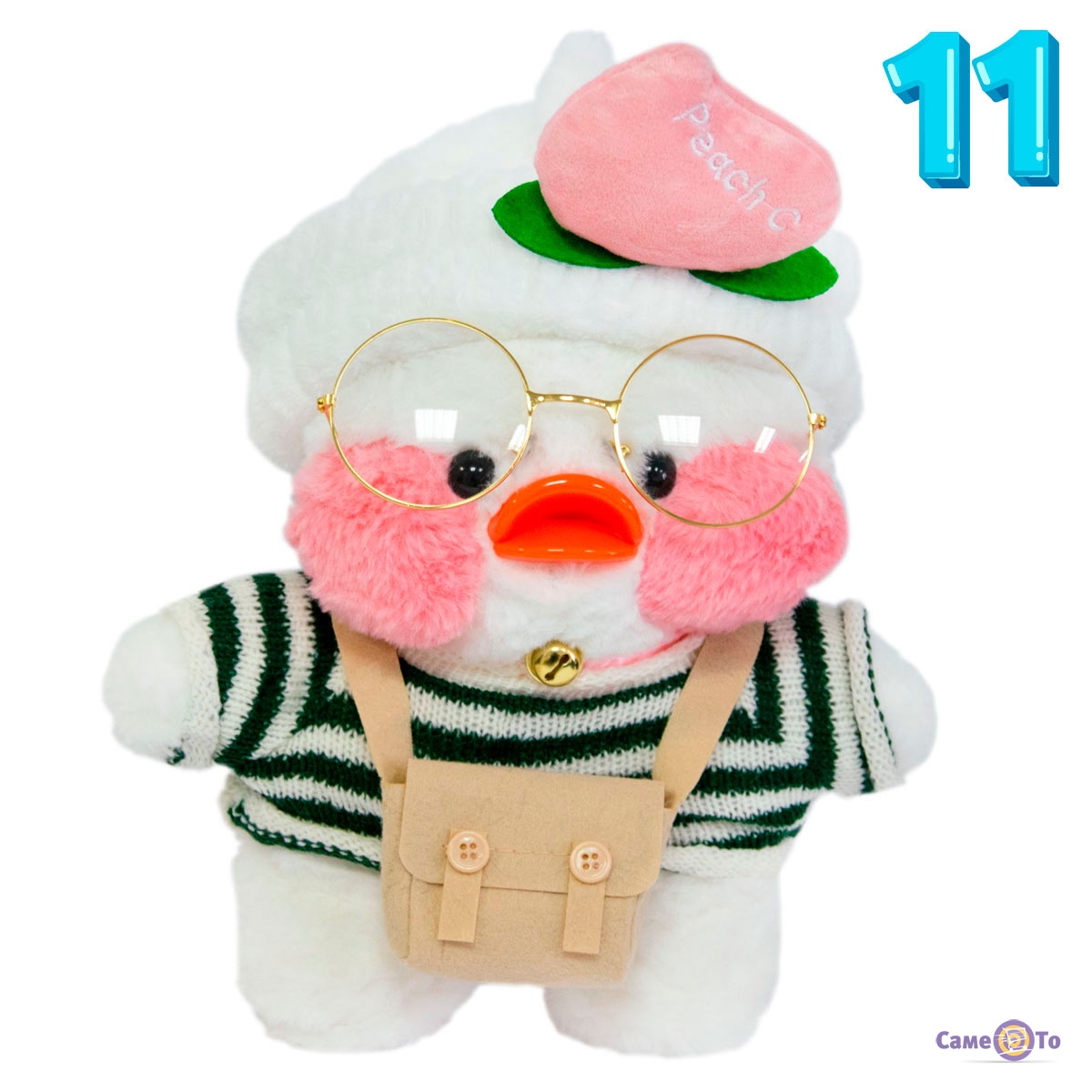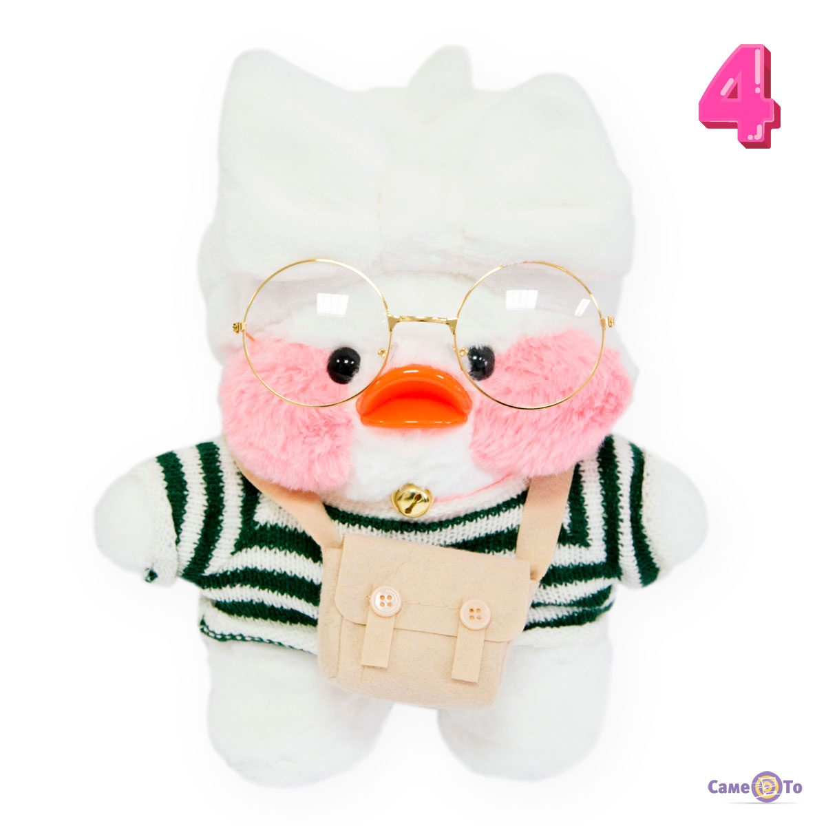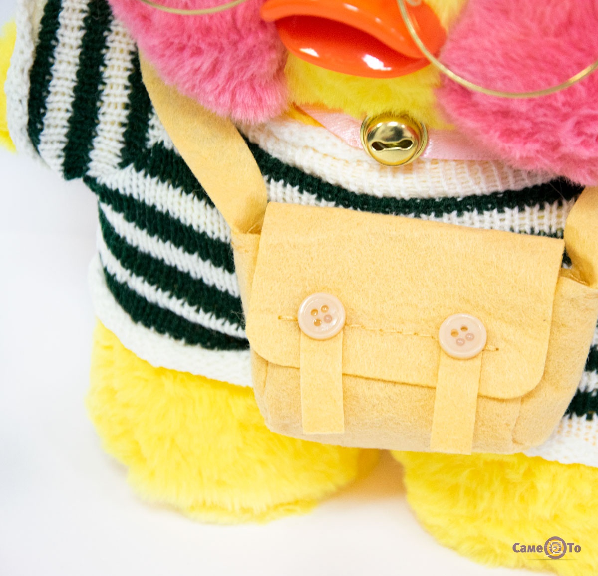 Качечка з окулярами зроблена з плюшу високої якості, який приємний на дотик і м'який. Основу наповнювача становить легкий синтепух, тому вага каченя лише 200 грам. Помаранчевий дзьоб іграшки виконаний із пластику. Висота з урахуванням чубчика становить 30 сантиметрів, у наборі з каченям представлений милі мініатюрні одяги та аксесуари.