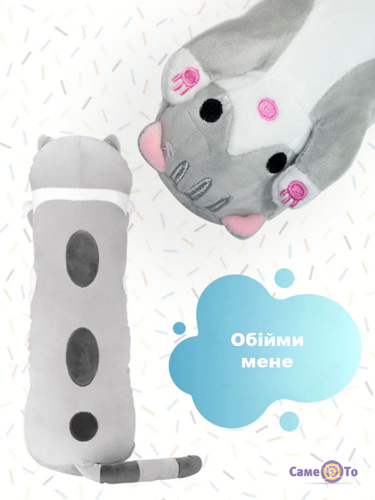 Кіт батон стане ідеальним варіантом подарунка і для дитини, і для дорослої. Цей довгий кіт має привабливий зовнішній вигляд, а завдяки дуже м'якій набивці він дарує неймовірно приємні тактильні відчуття. Ця іграшка обіймашка відмінно підійде для активних дитячих ігор, і для спокійного відпочинку чи сну. Іншими словами, м'яка іграшка подушка є універсальним виробом, який буде поруч і вдень, і вночі.
