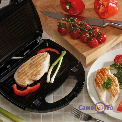 Он облегчит приготовление повседневных блюд и разнообразит ваш ежедневный рацион. Прибор состоит из 4-х сменных насадок так же основы с нагревательным элементом. Нагревательные элементы, в виде металлических трубок размещены с двух сторон кухонного прибора, и соприкасаются с сменными формами при этом нагревая их. За счёт этого нет необходимости переворачивать продукты, они будут равномерно прожарены на мультимейкере.