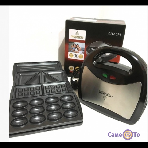 Сендвичница мультимейкер 4в1 Crownberg CB-1074 изготовлена из ударопрочного пластика, метала, а сами насадки покрыты тефлоном. Этот кухонный прибор не занимает много места, ему с легкостью найдётся место на вашей кухне.
