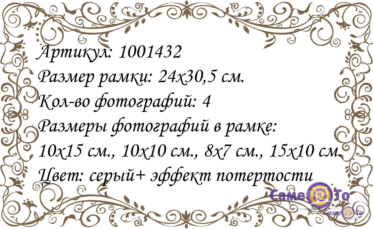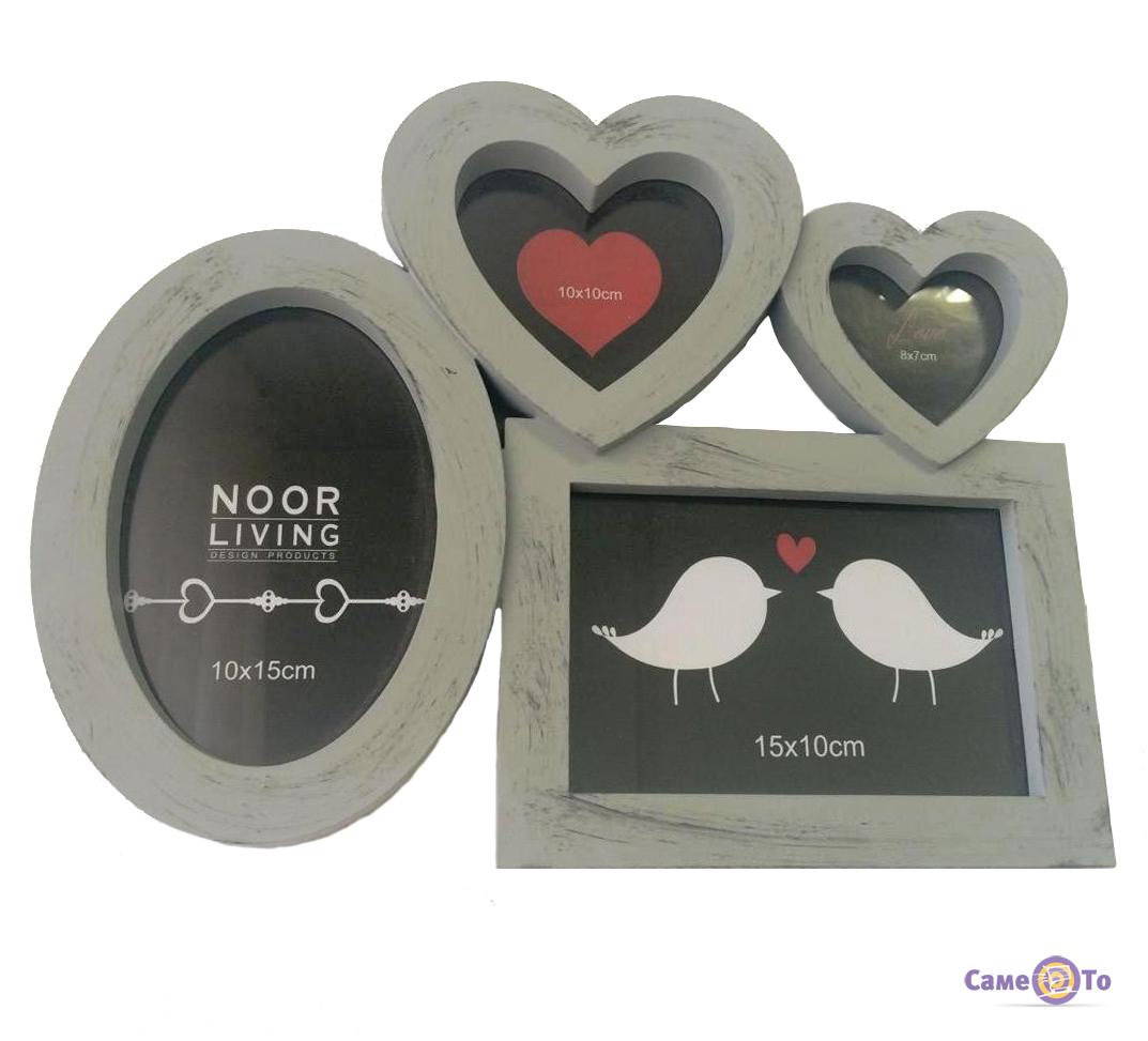Вы не знаете, чем разнообразить интерьер в квартире? Обратите внимание на данную мультирамку, которая способна стать изюминкой любого помещения. Она выполнена из пластика высокой прочности и вмещает четыре снимка неординарной формы и разного размера: два из них будут иметь форму сердечка, третий – овальную, четвертый – прямоугольную. Корпус мультирамки представляет собой серый цвет с эффектом старины (потертости). Высота изделия составляет 24 см, ширина – 30,5 см. Данную мультирамку можно купить для романтических фото в стиле Love-story или в качестве подарка своему возлюбленному.