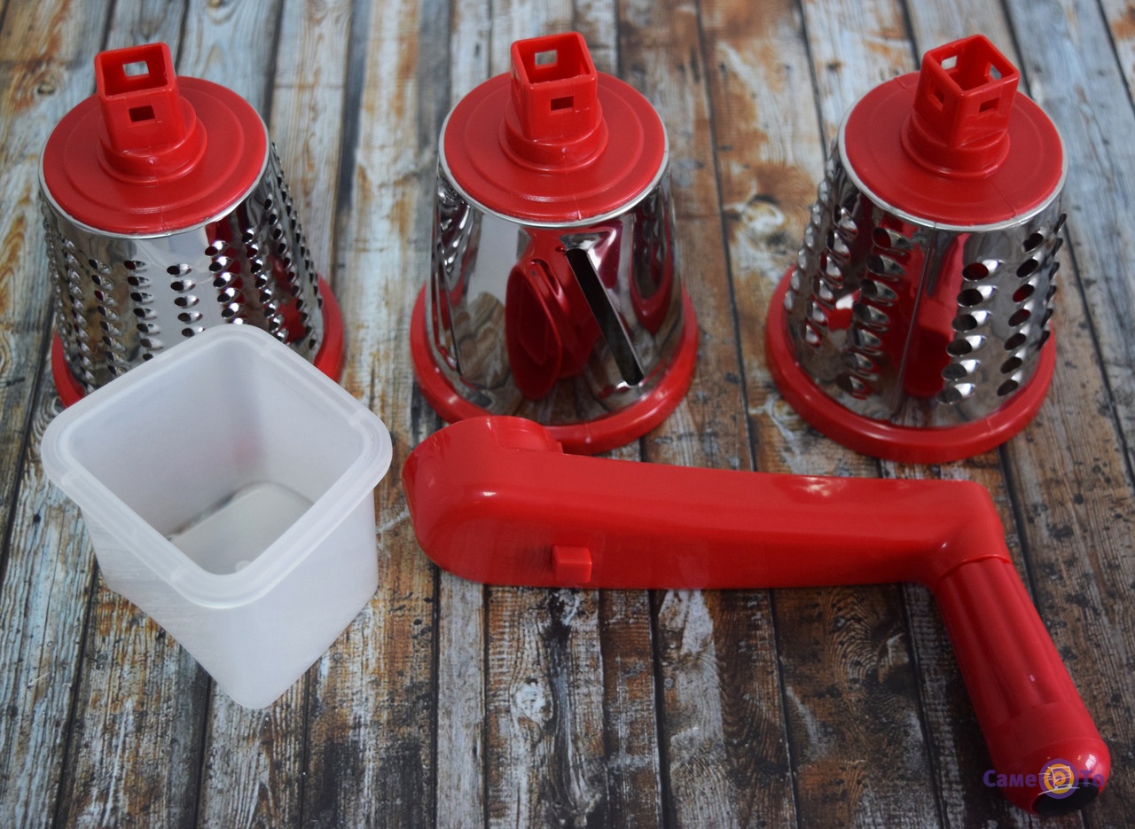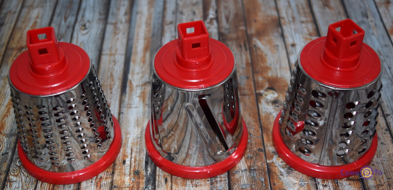 У комплекті є три насадки з нержавіючої сталі: дрібна і велика терки, а також терка-шатківниця. Всі насадки змінні і мають форму циліндра. Крім насадок, в комплектацію входить ще штовхач, ручка ну і власне, сам мультислайсер.