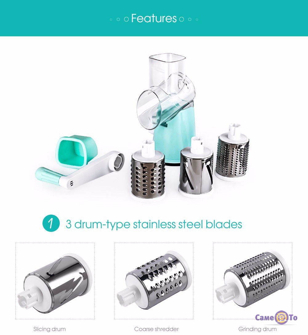 Где купить терку для овощей знает практически каждая хозяйка. А где выгодно купить измельчитель не каждая. Любая домохозяйка скажет, что самое сложное в приготовлении пищи – это терка для продуктов. Ведь во время процесса можно поранить палец, испортить новый маникюр или стереть часть ладони. Слайсер для овощей купить – это отличное решение, с помощью которого можно нашинковать капусту, натереть овощи или измельчить продукты без особых физических затрат. Представленная механическая овощерезка, под маркой Tabletop Drum Grater похожа на мясорубку. Она славится высокой эффективностью и мощными функциями.
