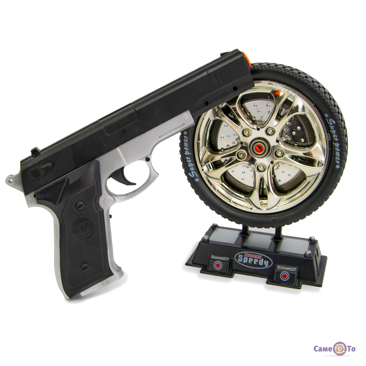 Дитячий пневматичний пістолет оснащений лазером, після пострілу і вдалого попадання в мішень, колесо починає крутитися, світяться лампочки та грає музика. Іграшкова зброя працює від батарейок тапа АА, всього потрібно 5 шт. (в комплекті їх немає.) Пістолет стріляє світловими променями. У набір входить: сам пістолет, мішень у вигляді колеса. Замовити іграшковий пістолет можна в якості подарунка хлопчикові від 5 років. Така іграшка підкорить його з перших хвилин гри.