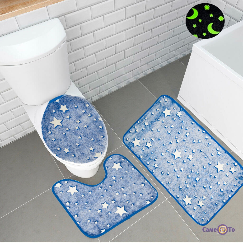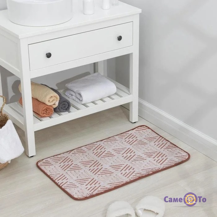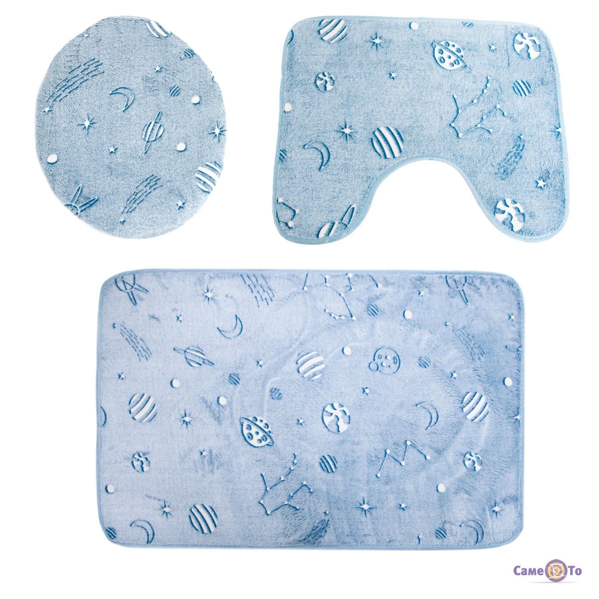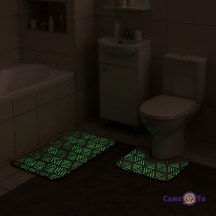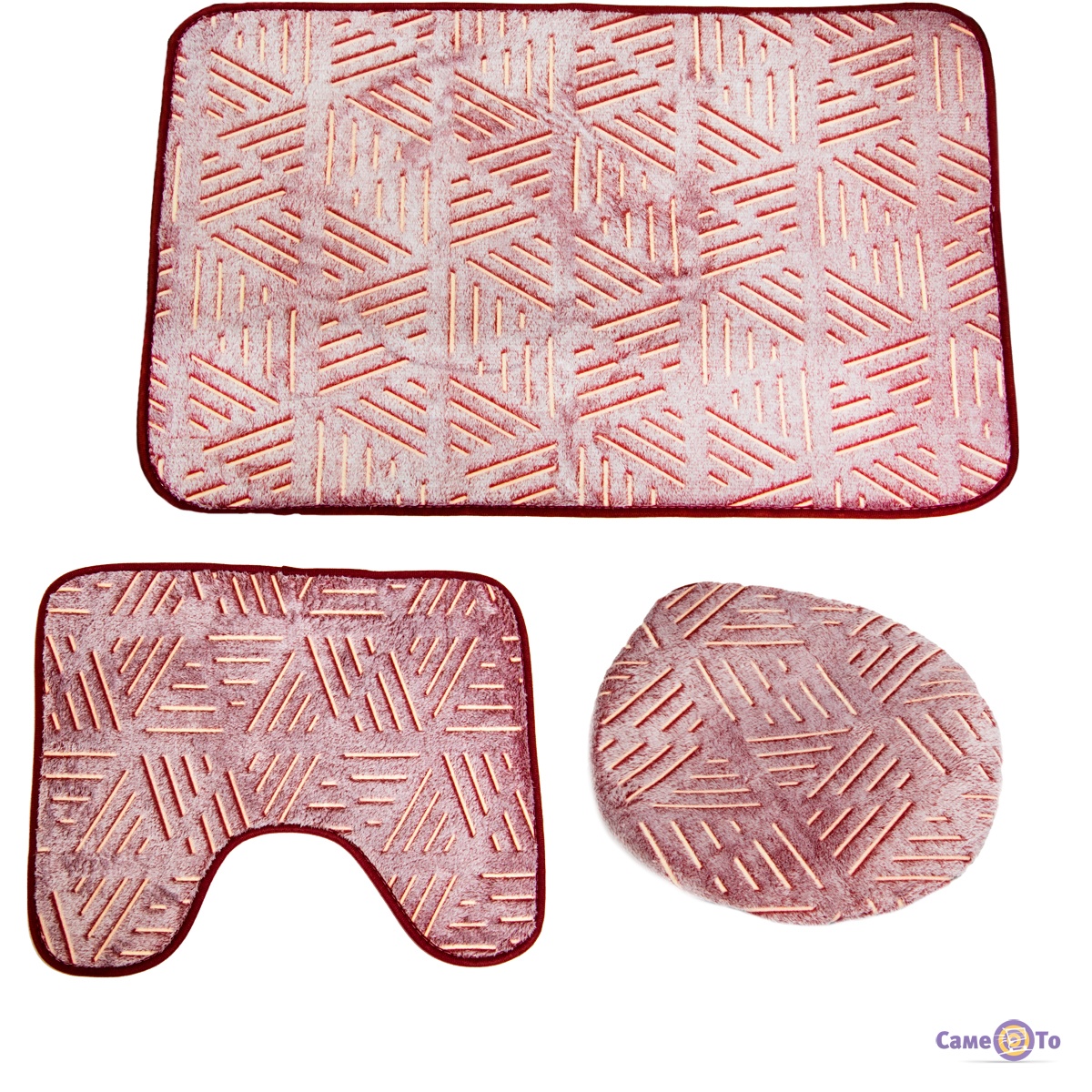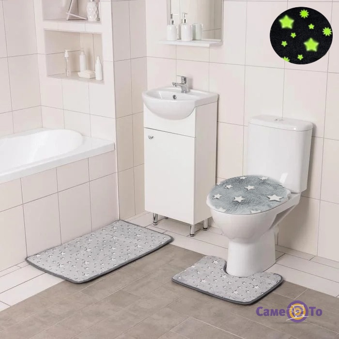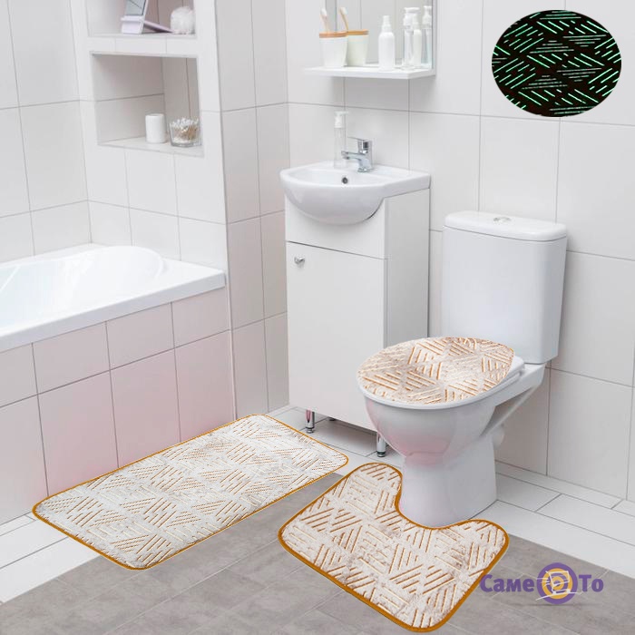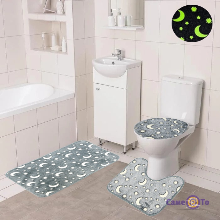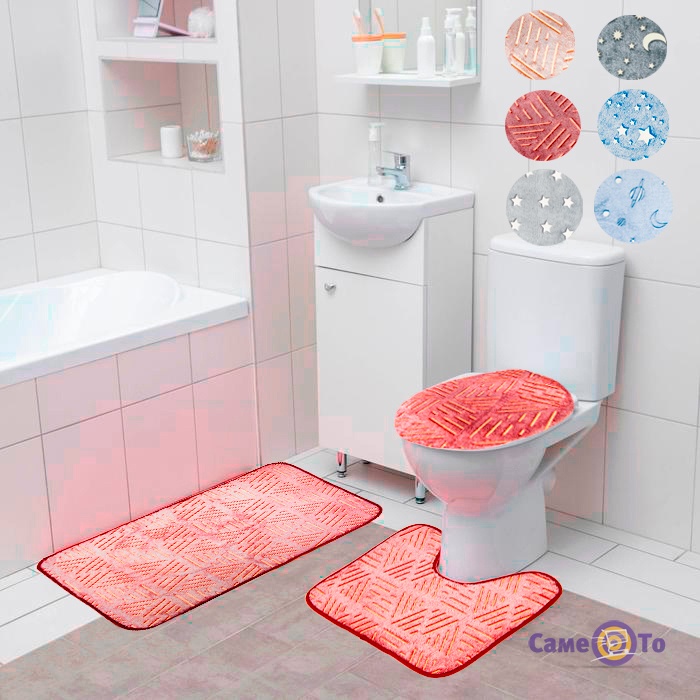 Килимки для ванної кімнати є невід'ємною частиною інтер'єру ванної. Цей набір килимків включає: килимок для ванної кімнати, килимок для туалету, м'який чохол для туалету. Набір килимків у ванну кімнату виготовлений у ніжних відтінках, за рахунок чого підійдуть під будь-який інтер'єр. Вироби мають короткий та м'який ворс. Також килим у ванну кімнату має невеликі гумові «кнопки» знизу, що запобігає ковзанню. Розміри стандартні, вага дорівнює 350 г. На 80% килимок складається з поліестеру та на 20% з ТПР.