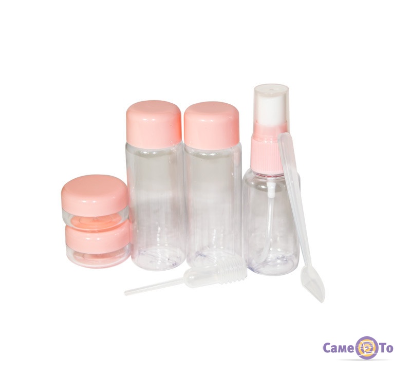 Виготовлені баночки з пластика, а значить вони дуже легкі і компактні. У комплекті йде 7 прозорих баночок з рожевими кришками. Крім того, вони мають різну форму, обсяг і кожна з яких призначена для своєї рідини. У наборі можна знайти одну баночку з дозатором, дві баночки для рідини і 2 баночки для крему. Така велика кількість дозволяє перевозити з собою все найнеобхідніше.