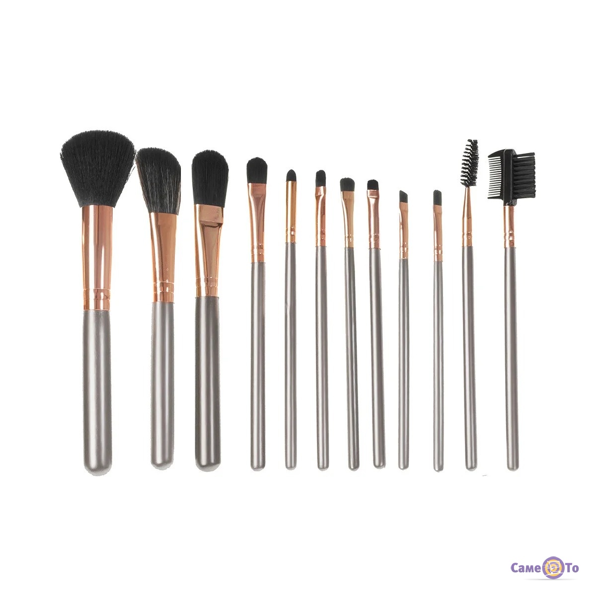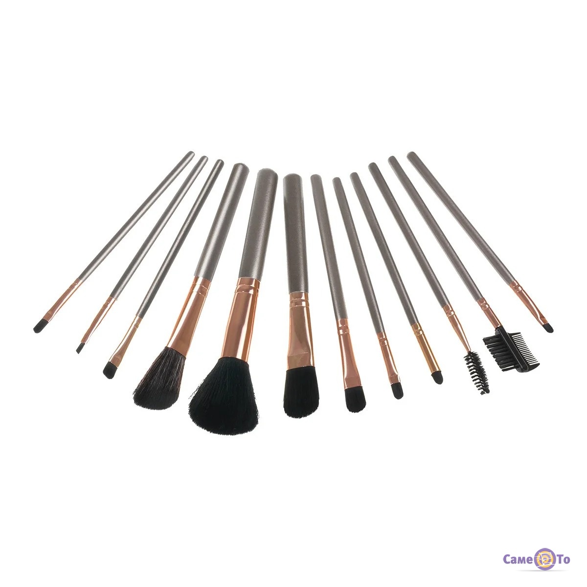 Набір пензлів для макіяжу обличчя, очей і брів з 12 штук в бронзовому чохлі