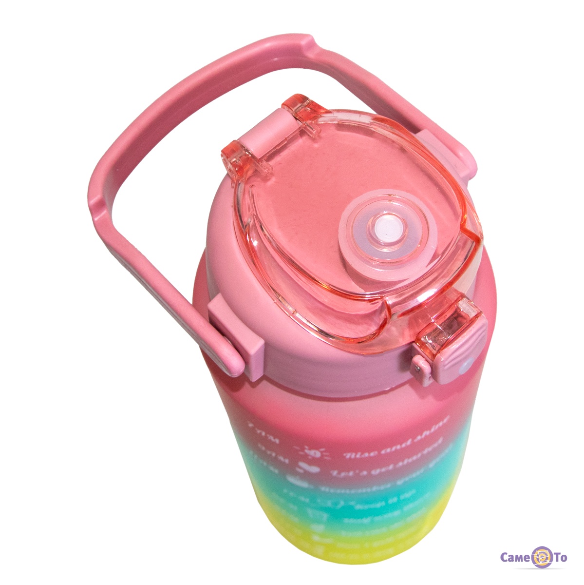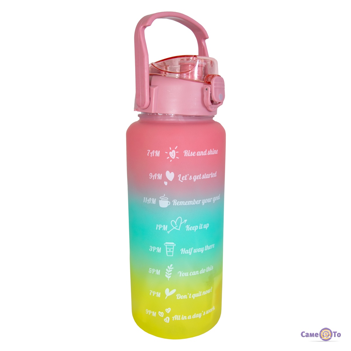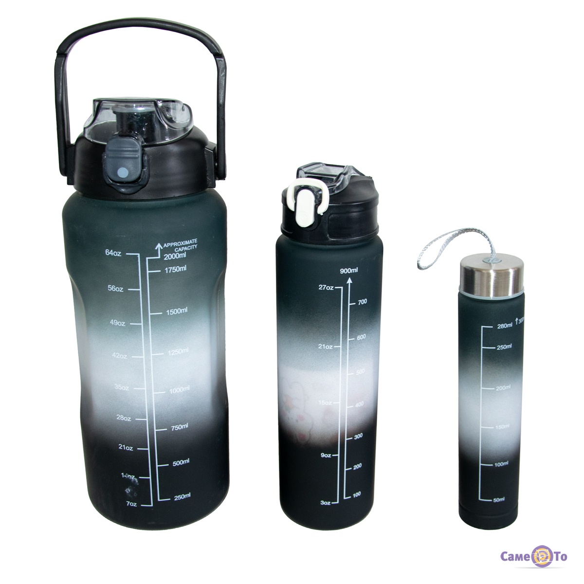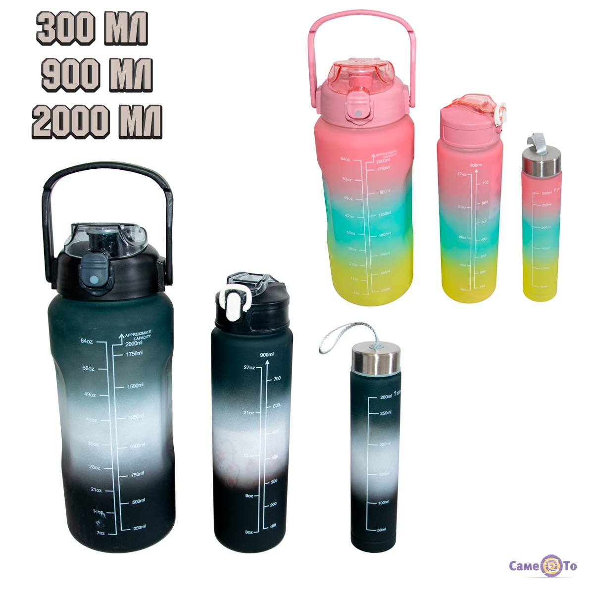Набір спортивних пляшок для води об'ємом 300 мл, 900 мл і 2000 мл включає три стильні пляшки у кольорах: рожевий-блакитний-жовтий та чорний-білий-чорний.