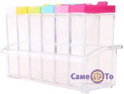 Набор спецовниц включает шесть контейнеров, которые удобно размещаются в специальной подставке. Небольшие размеры набора позволяют хранить его не только на рабочем столе, но и на полке в кухонном шкафу или даже в выдвижном ящичке тумбочки. Хотя набор выглядит очень креативно и сможет дополнить и украсить интерьер кухни.