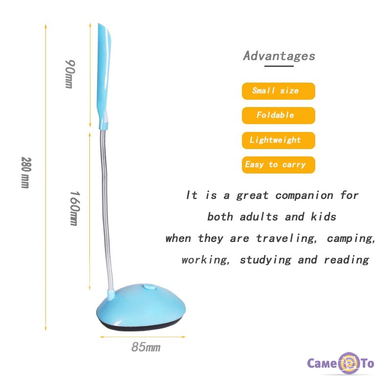 Настільний світильник ідеально підходить для використання в офісі, домашньому кабінеті, на природі або в поїздках. Батарейки типу AAA забезпечують тривалий час роботи світильника без необхідності постійного заряджання або підключення до електромережі. Це робить його зручним та економічним рішенням для освітлення в будь-яких умовах.