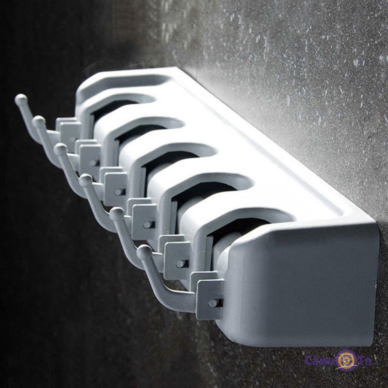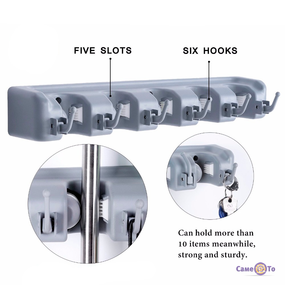 Настінний тримач для швабри та щіток на 5 відсіків та 6 гачків 11х40 см