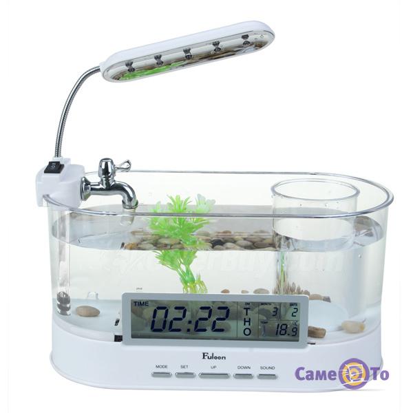 USB аквариум отлично выполняет роль органайзера. В его корпусе есть колонка, которая издает разные звуки природы, такие как пение птиц, журчание ручья и пр. Можно выбрать любую из 6 мелодий. На передней части аквариума расположен дисплей с подсветкой, где отображаются электронные часы, а также будильник, календарь и термометр. Для работы колонки и часов используются пальчиковые батарейки. Дизайн аквариума органайзера гармонично дополняет наличие удобного стаканчика, который поможет поддерживать порядок на вашем рабочем столе. В нем можно хранить ручки, карандаши, канцелярские ножи и т.д.