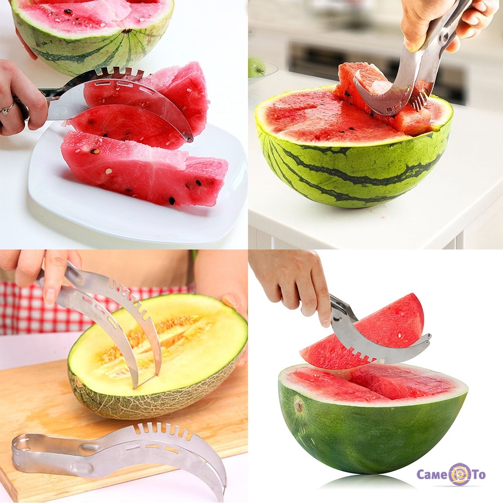 По-перше, використовувати прилад можна не тільки в якості ножа, але і як щипці, тобто спочатку Ви можете красиво порізати кавун часточками, а потім зручно захопити їх щипцями. По-друге, при експлуатації цього атрибута всі скибочки виглядають естетично, так як мають однакову товщину і розмір. По-третє, виріб виготовлений з якісної нержавіючої сталі і відмінно підходить для миття в посудомийній машині. Він не піддається механічній деформації і корозії, навіть при постійному контакті з водою і соком. Ну і, звичайно ж, варто сказати про те, що ніж має ергономічну форму, тому зручно лежить в руці і не вислизає в процесі нарізки.