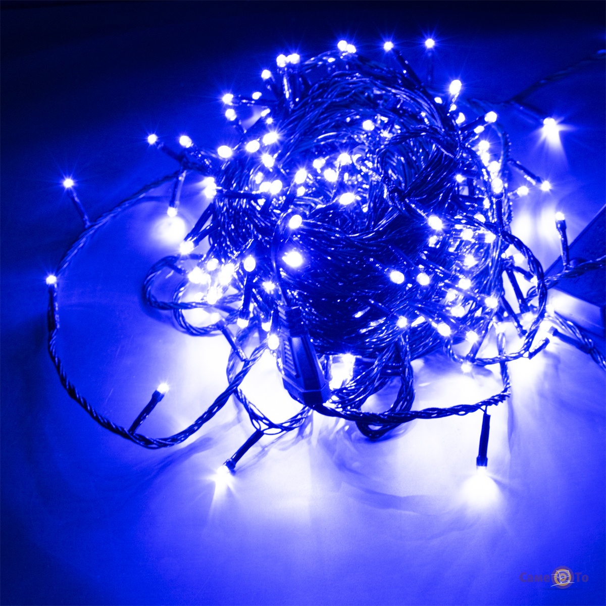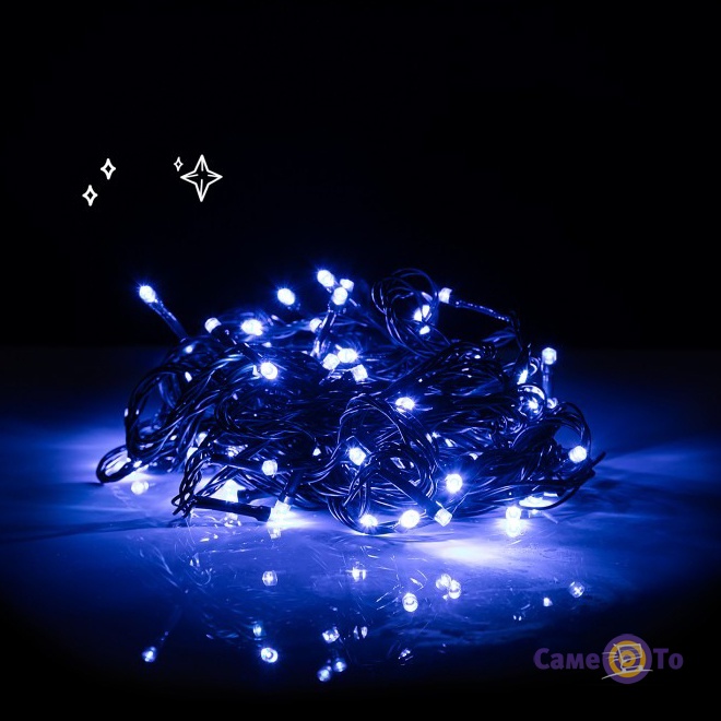 Новогодняя гирлянда позволяет украсить помещенье с большей площадью, ведь она обладает способностью последовательно соединяться с подобными устройствами. Количество светодиодных огоньков в одной гирлянде – 250 шт. Цвет их синий. Он очень приятный для глаз и не вызывает никакого раздражения.