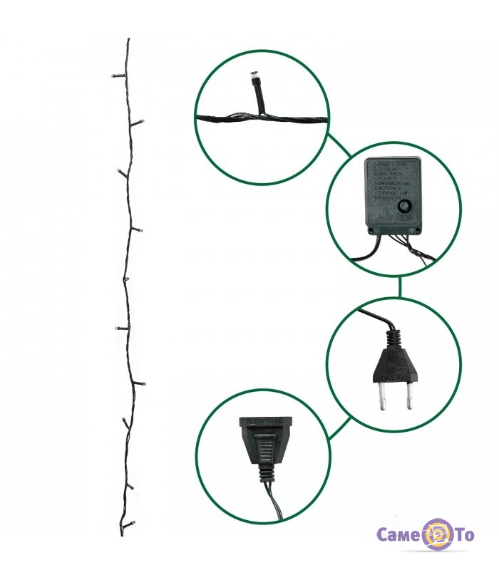 УВАГА!!! Гірлянди даної моделі сумісні між собою і можуть бути з'єднані один з одним послідовно завдяки спеціальному перехіднику-розетці, який є в кожній гірлянді цієї моделі. У цей перехідник-розетку можна вставити вилку наступної гірлянди та з'єднувати їх між собою (за принципом "тато-мама"), утворивши таким чином ланцюг із гірлянд, підключений до одного джерела живлення (до однієї розетки).