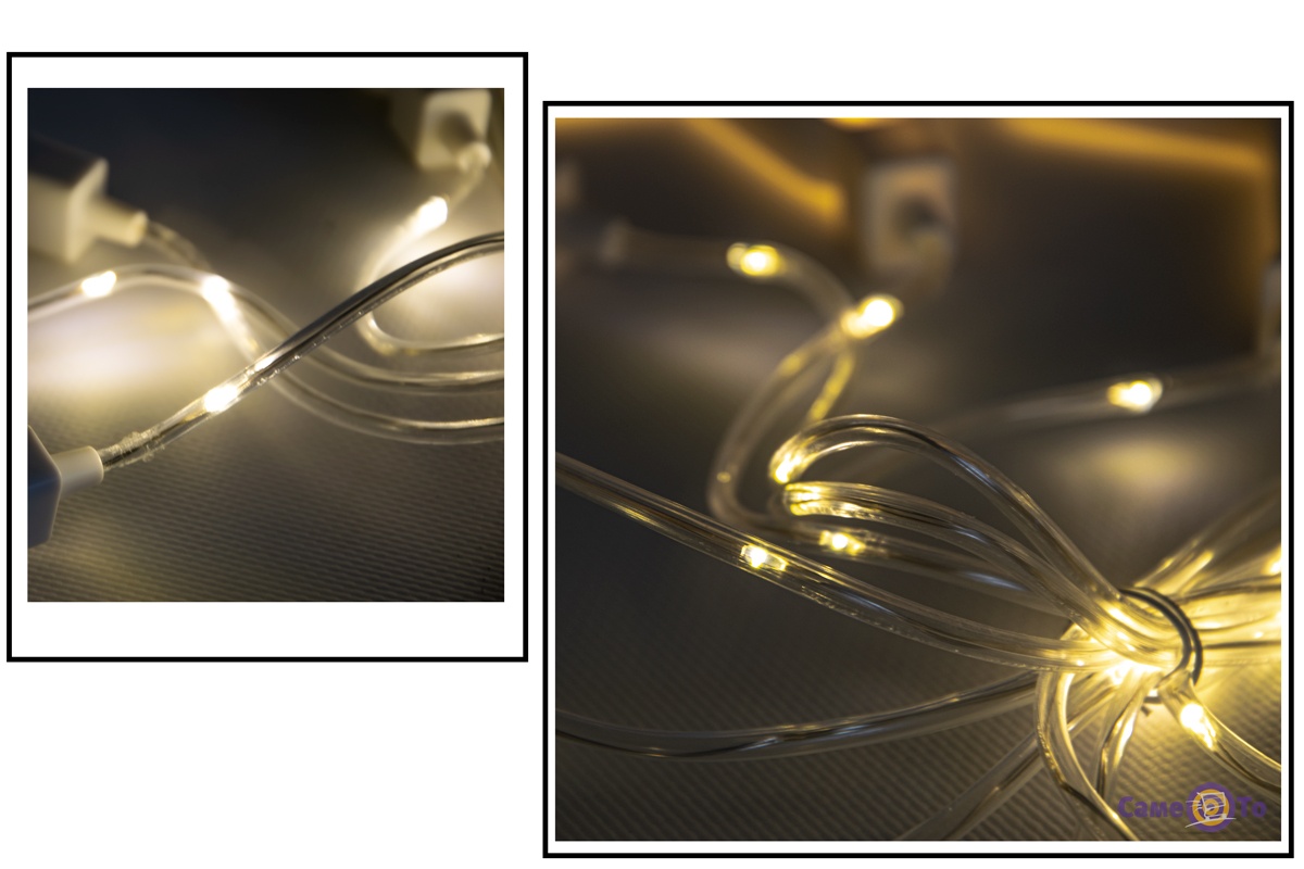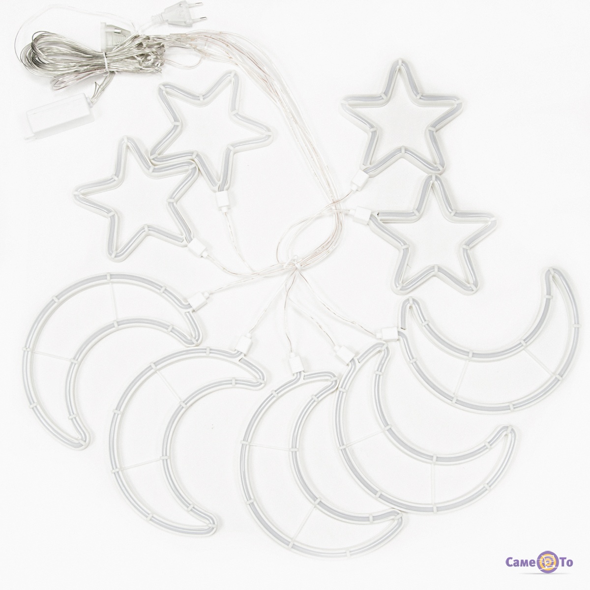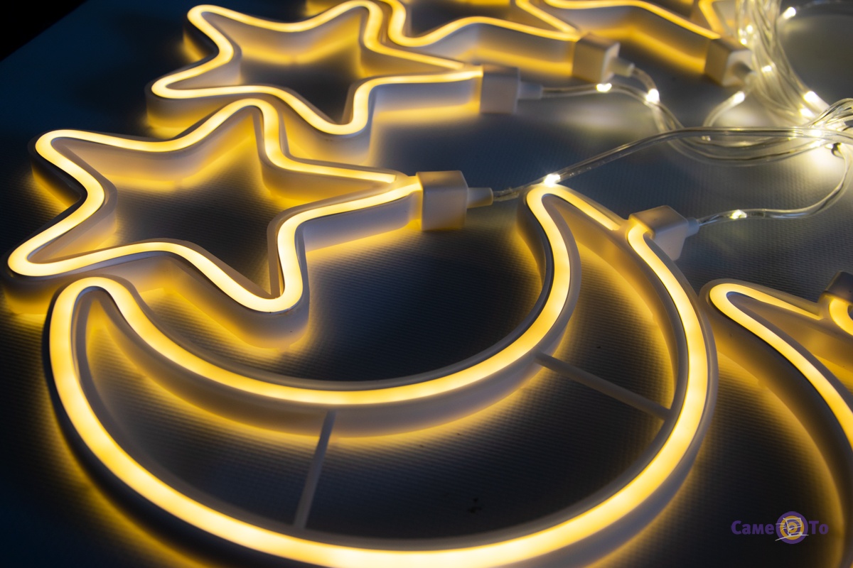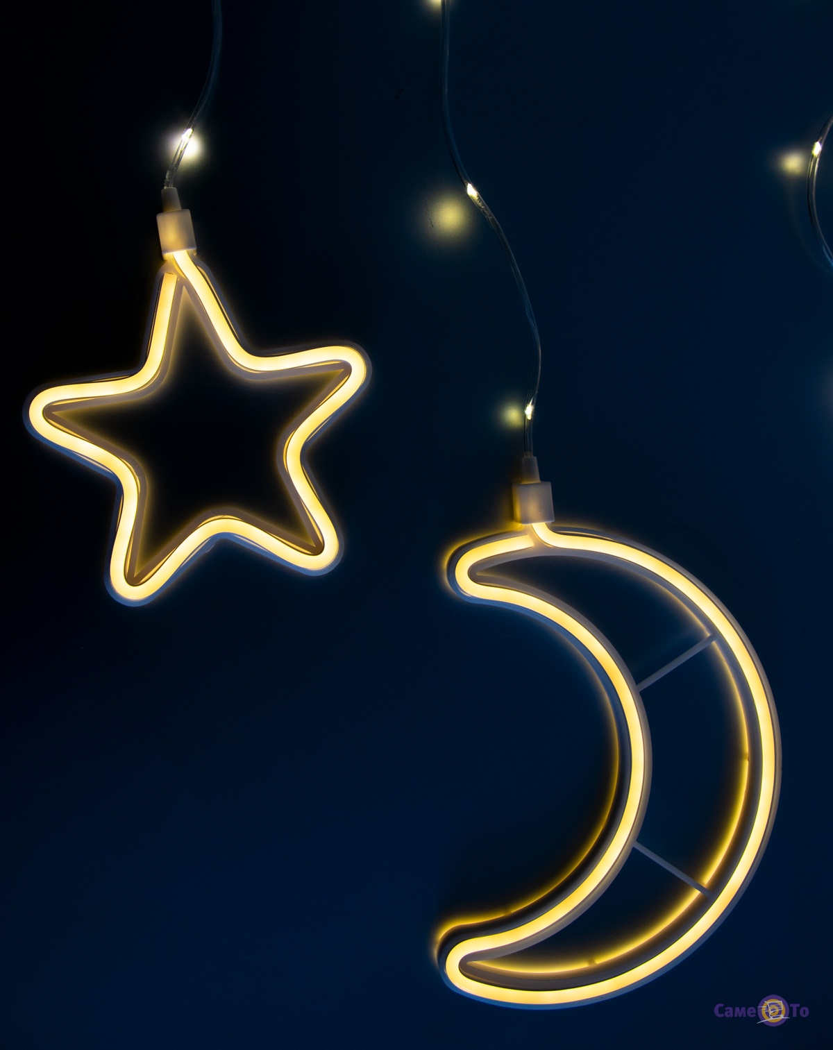 Світлодіодна гірлянда працює від мережі, і всередині кожної фігурки знаходиться LED-лампа з білим теплим світінням. Крім цього, світлодіоди розкинуті і по всій діні дроту. Гірлянди на Новий Рік покриті спеціальним силіконовим шаром, що створює візуальний ефект підвіски, завдяки якому зірочки та півмісяці ніби ширяють у повітрі, не з'єднуючись із дротом. Це задає атмосферу чарівної казки та тон настрою.