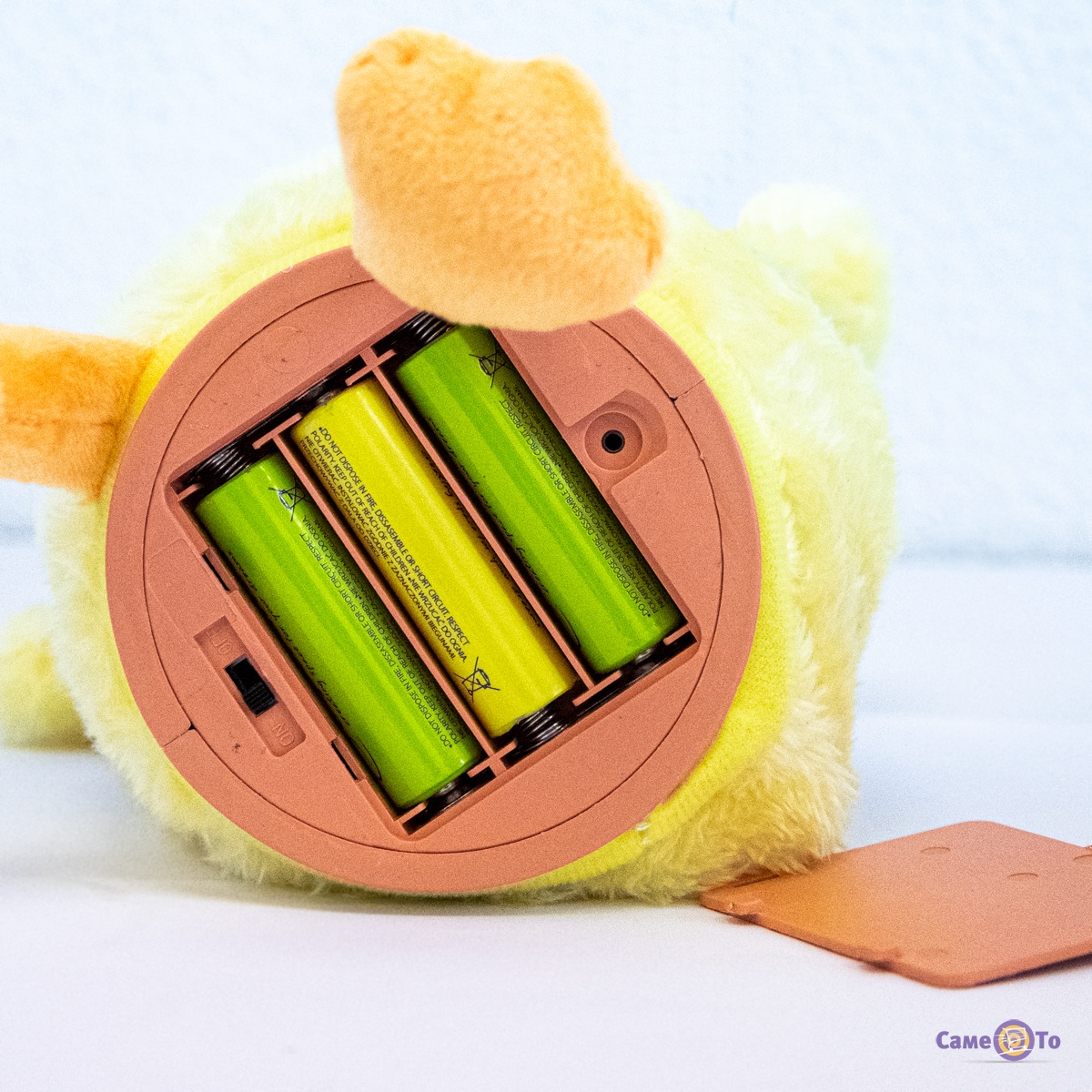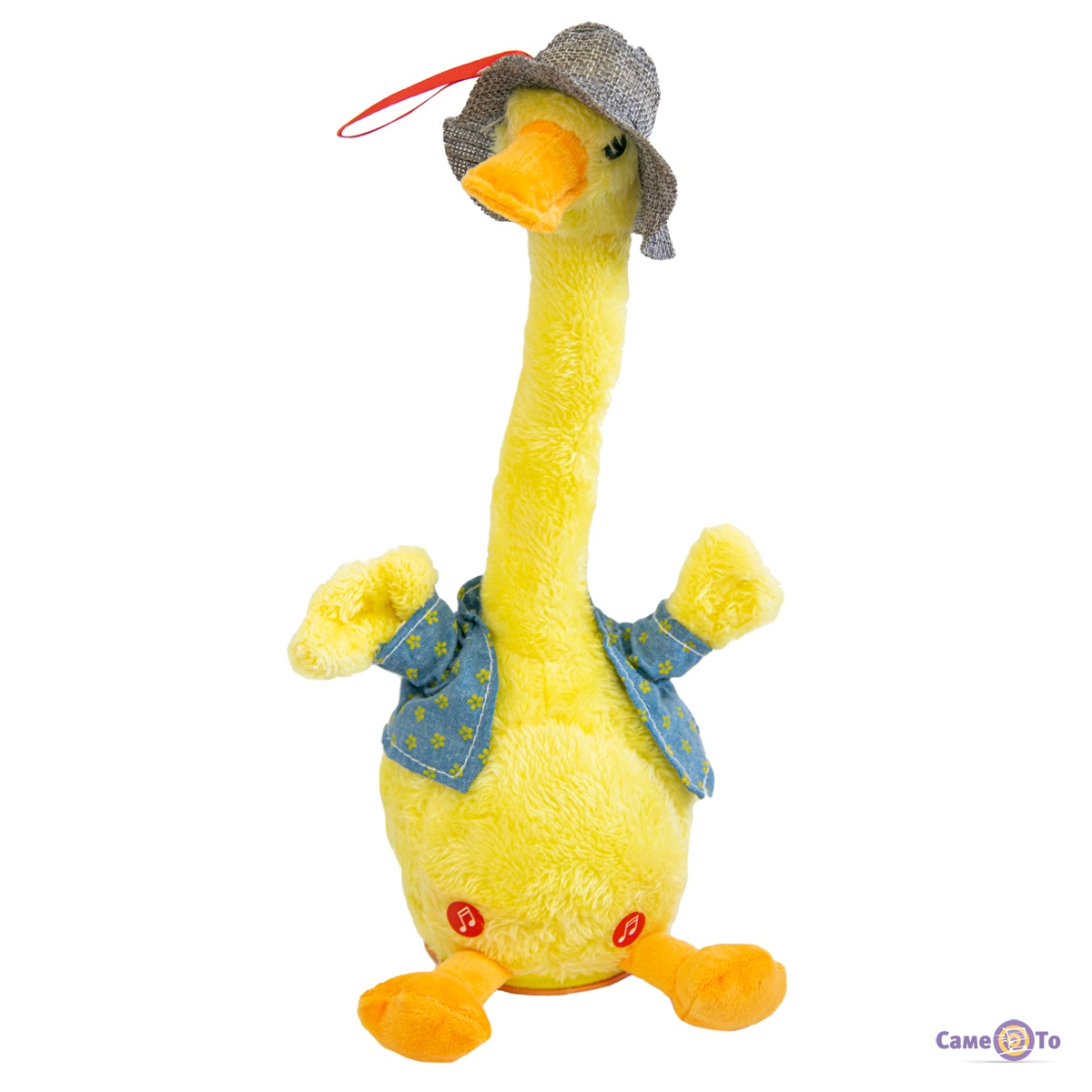Під спокійну мелодію можна відпочити, розслабитися, а під веселі та кумедні пісеньки – потанцювати. Жовта інтерактивна розвиваюча іграшка в синьому жилеті або шарфом оснащена звуковою системою, яка повторює звуки у високій якості. Вона вміє танцювати, чудово крутить шиєю, з нею можна разом зробити зарядку. З цим милим звірятком можна посміятися і заспівати улюблену пісеньку, поговорити чи обговорити мешканців іграшкового світу. Іграшка виготовлена з безпечного пластику та плюшу, вага 180 грам, розмір 33*20*12 см. Для активізації м'якої качки необхідно вставити 3 батареї типу АА. Інтерактивна іграшка повторюшка стане прекрасним другом дівчинці та хлопчику з 3-х років.