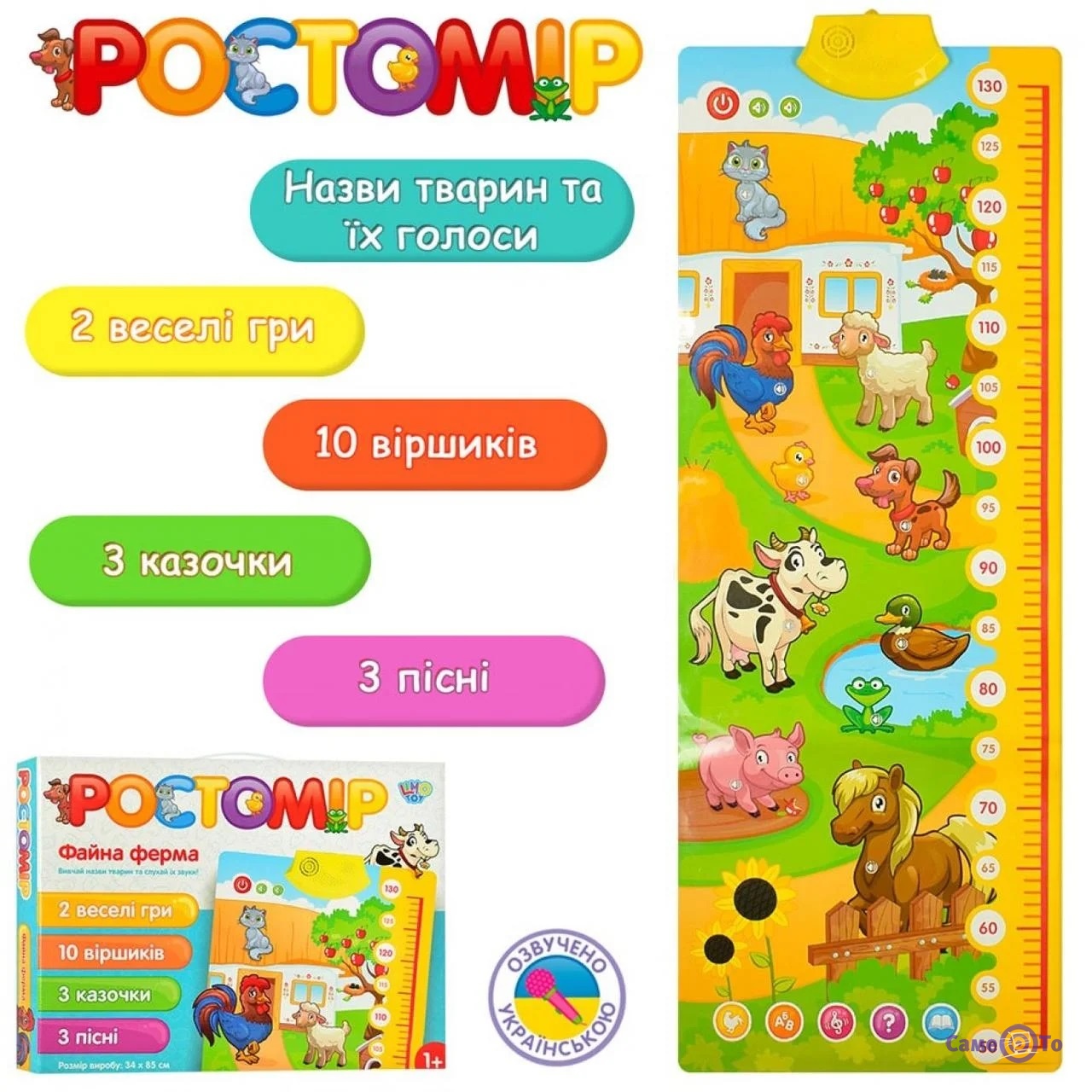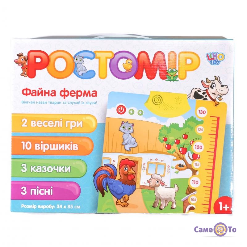Дана модель зуміє не тільки виміряти зріст дитини, але і зіграє з нею у різні захоплюючі ігри, розповість десять віршів, які легко запам’ятати. Більш того, ваша дитина зможе прослухати три казки і співати з ростоміром три дитячі пісеньки. Ігри в ростомірі «Файна Ферма» заслуговують на окрему увагу, адже граючи в них дитина безпосередньо взаємодіє із зовнішнім світом, реагує на нього і дає відповіді. Малюк зможе пограти в гру «Чий голос?» і спробує розгадати легкі дитячі загадки. Крім всіх цікавих функцій, хочемо звернути окрему увагу на склад товару. Якісні складові будуть абсолютно безпечні для вашого малюка, а міцні матеріали вбережуть товар від пошкоджень. Надзвичайно важливо розуміти, що подібні інтерактивні іграшки розвивають у дітей координацію руху, уважність і моторику. Також, ті діти, котрі щодня користуються даним товаром, покращують пам'ять, вчать цифри, казки і знайомляться з навколишнім світом. Висота настінного зростоміра становить 90 сантиметрів. Ширина в 34 сантиметри дозволила з легкістю вмістити в собі всі інтерактивні складові іграшки. Для того, щоб зростомір працював довго, конструктори оптимізували його роботу під батарейки ААА. Всі пісеньки, вірші, казки і гри озвучені українською мовою. Ваш малюк з дитинства зможе привчатися до культури українського мовлення. Якщо ви вирішили зробити подарунок дитині, то настінний зростомір комплектується картонним пакувальним боксом, який вигідно представить подарунок дитині будь-якого віку. Даруйте дітям радість, за допомогою зростоміра «Файна Ферма».