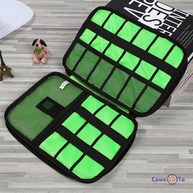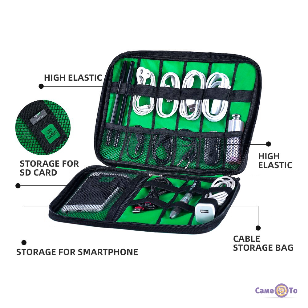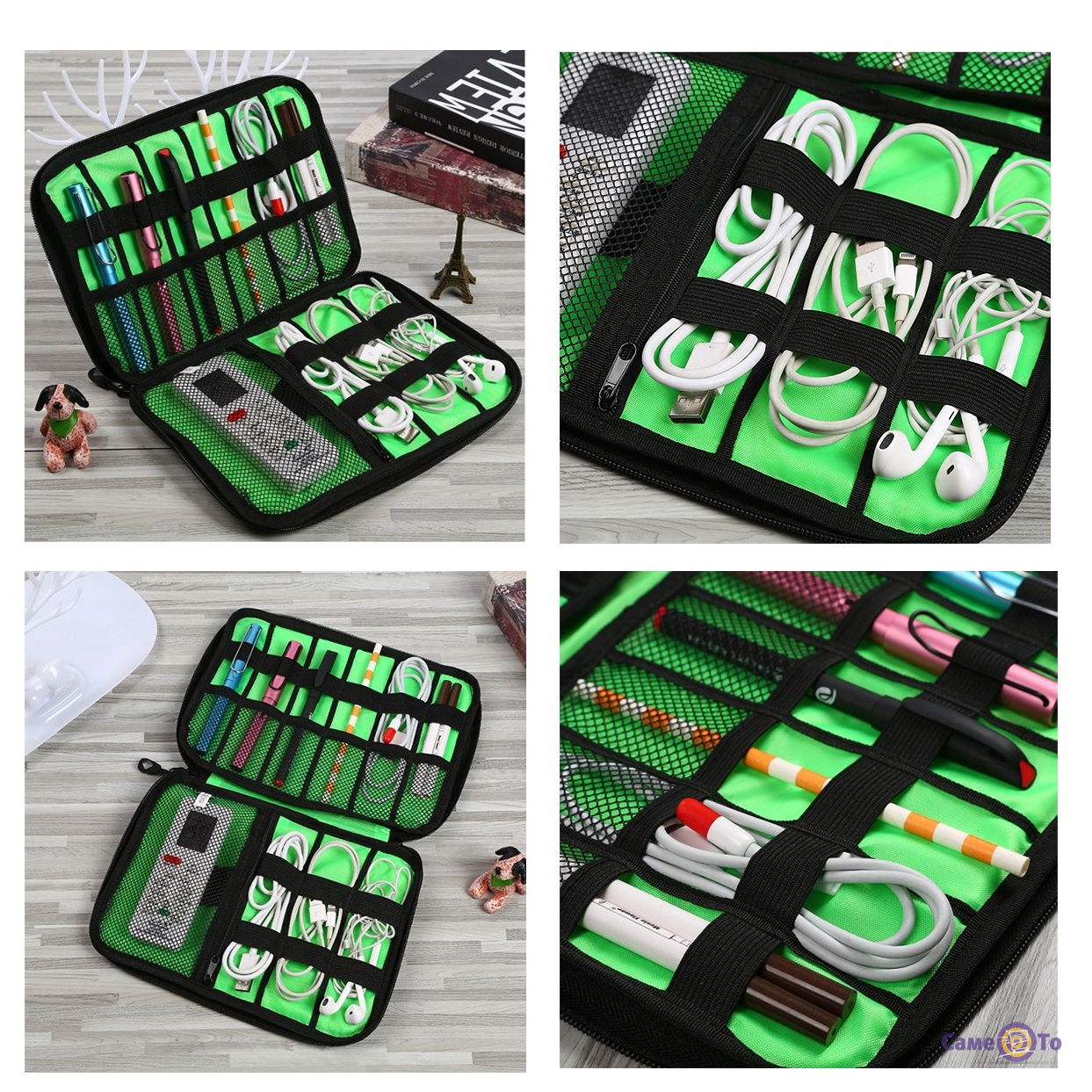 Цей органайзер також ідеально підходить для мандрівок. Ви можете запакувати всі необхідні дроти та зарядки в одне місце, що заощадить місце в багажі та спростить організацію вашої електроніки в дорозі. Виготовлений із міцного матеріалу, органайзер забезпечує довговічність та захист ваших аксесуарів від пошкоджень. Крім того, компактний розмір робить його зручним у використанні та перенесенні.