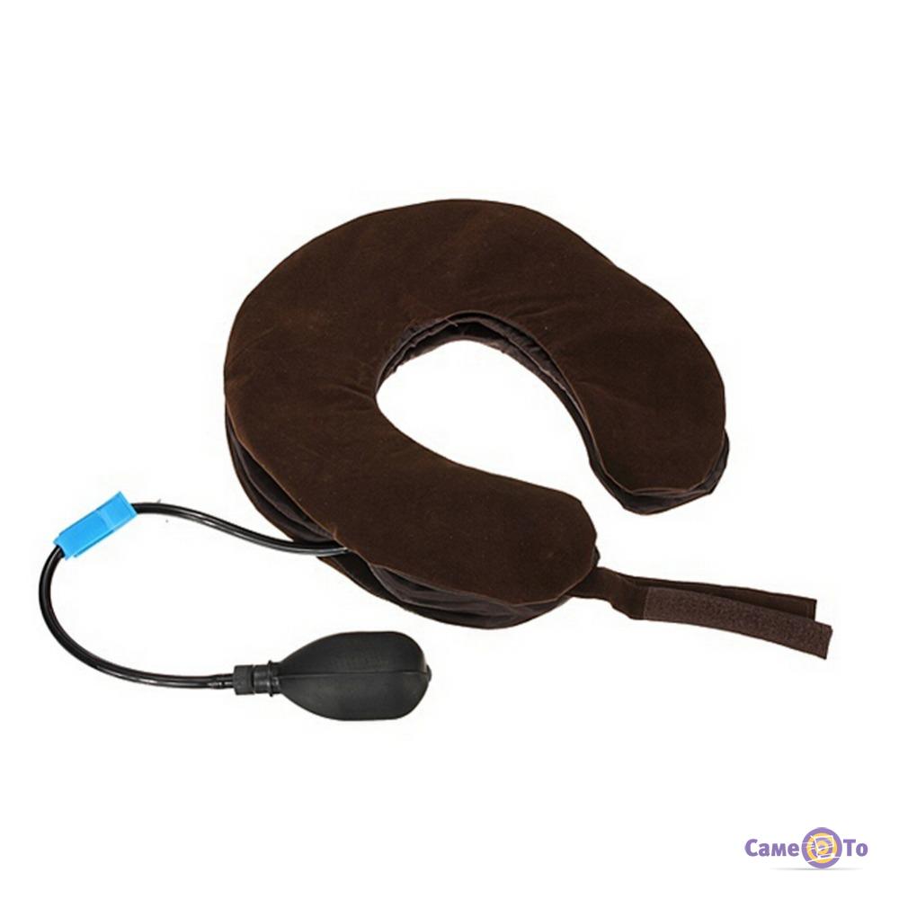 Шейная воздушная подушка – массажёр Trаctors for cervical spine имеет вид трёх скреплённых между собой надувных колец. Кольца изготовлены из фланелевой гипоаллергенной ткани. Надувается устройство с помощью ручного насоса. Поступление и спускание воздуха происходит через медный клапан. Количество воздуха в кольцах можно регулировать при помощи спускного шарообразного клапана.