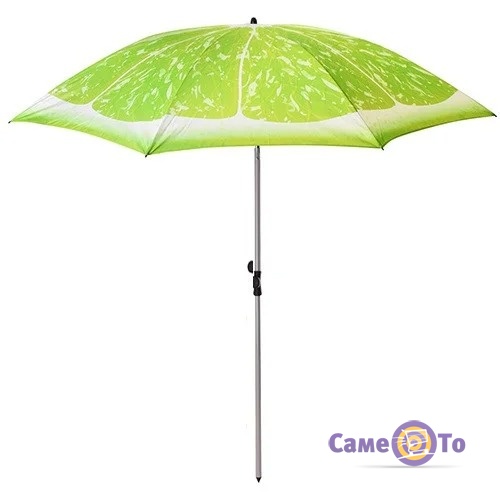Він також вважається незамінним аксесуаром на дачній ділянці при частих дощах. Більше не обов'язково сидіти вдома в дощову погоду. Така пляжна парасолька достатньо міцна, дуже надійна, не боїться сильних вітрів. При необхідності в ній можна змінити рівень нахилу. Ця парасолька дуже компактна, її можна купити і покласти в багажник машини. В розкладеному вигляді висота парасольки дорівнює 1.8 метрам, а тому користуватися такою парасолею зможе навіть високий чоловік. Мінімальна висота становить 1.4 метра, а це означає, що дачна парасольку такого типу сховає від палючого сонця навіть дитину. Дизайн купола парасольки має унікальний і барвистий візерунок – його поверхню оформлено у вигляді цедри лайма. Парасолька виготовлена з поліестеру - дуже якісного матеріалу, який не вигоряє під прямим сонцем і не псується з часом. Дана модель пляжної парасольки оснащена зручним механізмом нахилу, що дозволяє вибрати зручне положення парасолі при її безпосередньому використанні. Також є гвинтовий механізм фіксації коліна осі. Поставка парасольки від постачальника відбувається в м'якій поліетиленовій упаковці. Важить ця парасоля садова всього 2 кілограми.