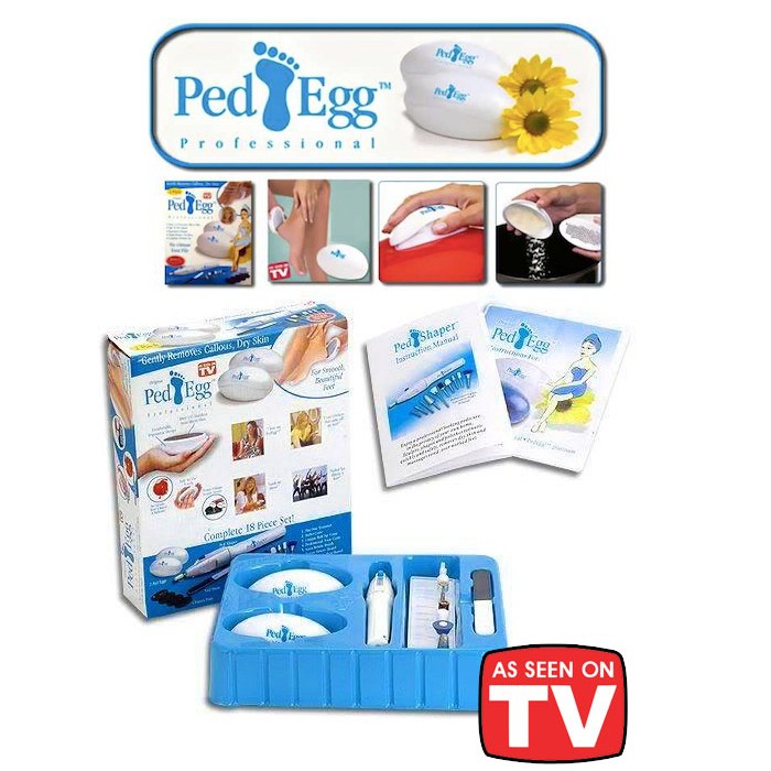 Терка-пемза, за допомогою якої видаляються мозолі, натоптиші і інші нарости, має зручну форму, нею простіше і швидше орудувати. Для збору всіх видалених частинок шкіри призначений спеціальний контейнер, що додає приладу балів по частині гігієнічності і зручності. Педикюрний набір Ped Egg Professional 18 предметів включає 10 насадок, з якими можна швидко провести всі маніпуляції, пов'язані з проведенням педикюру в домашніх умовах.
