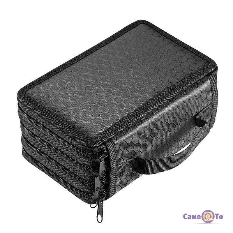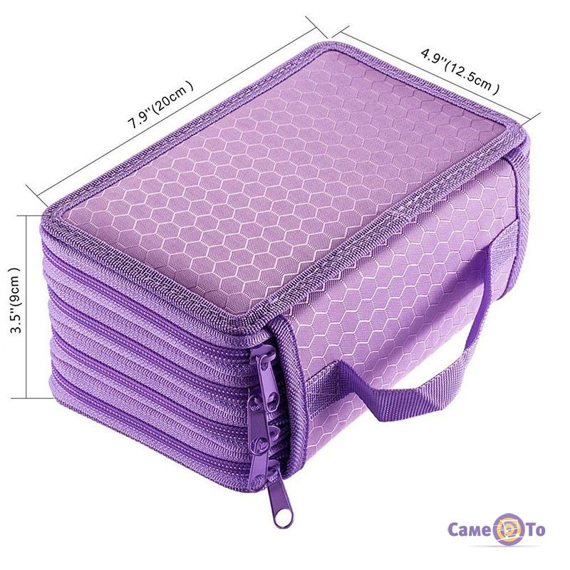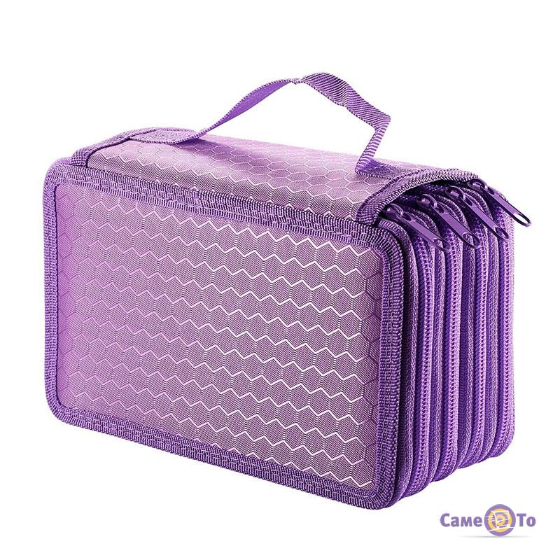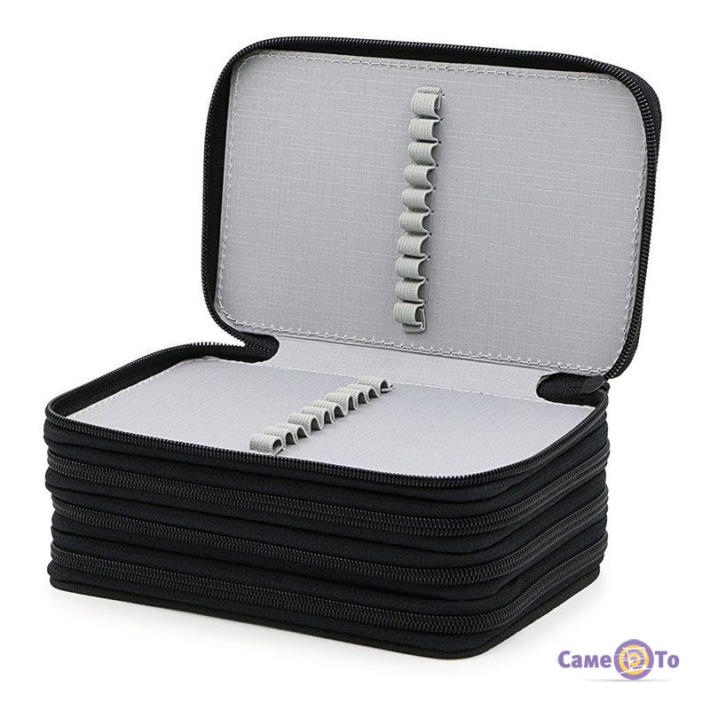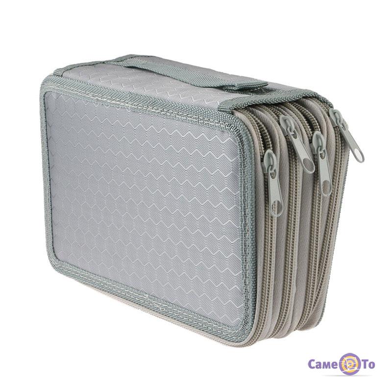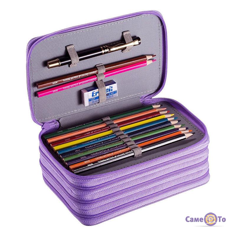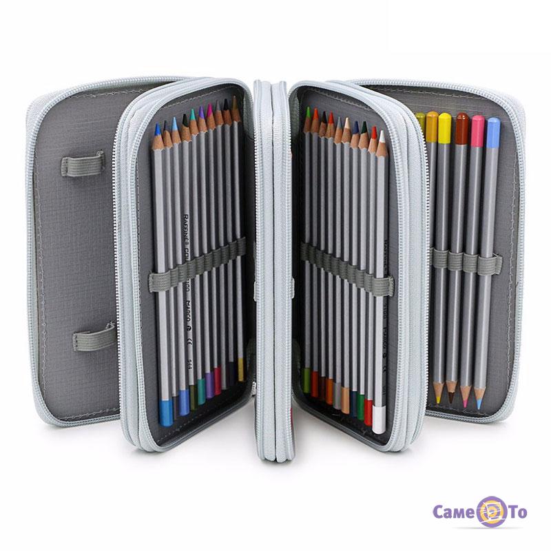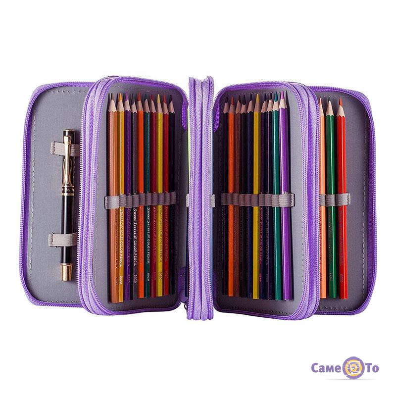 Пенал на 4 відділення виготовлений з щільної міцної тканини і картону. Він легкий (важить всього 270 грамів), стійкий до витирання, не ламається при падінні. Кожне відділення має окрему застібку-блискавку. Зручна тканинна ручка дозволяє носити пенал як сумочку.
