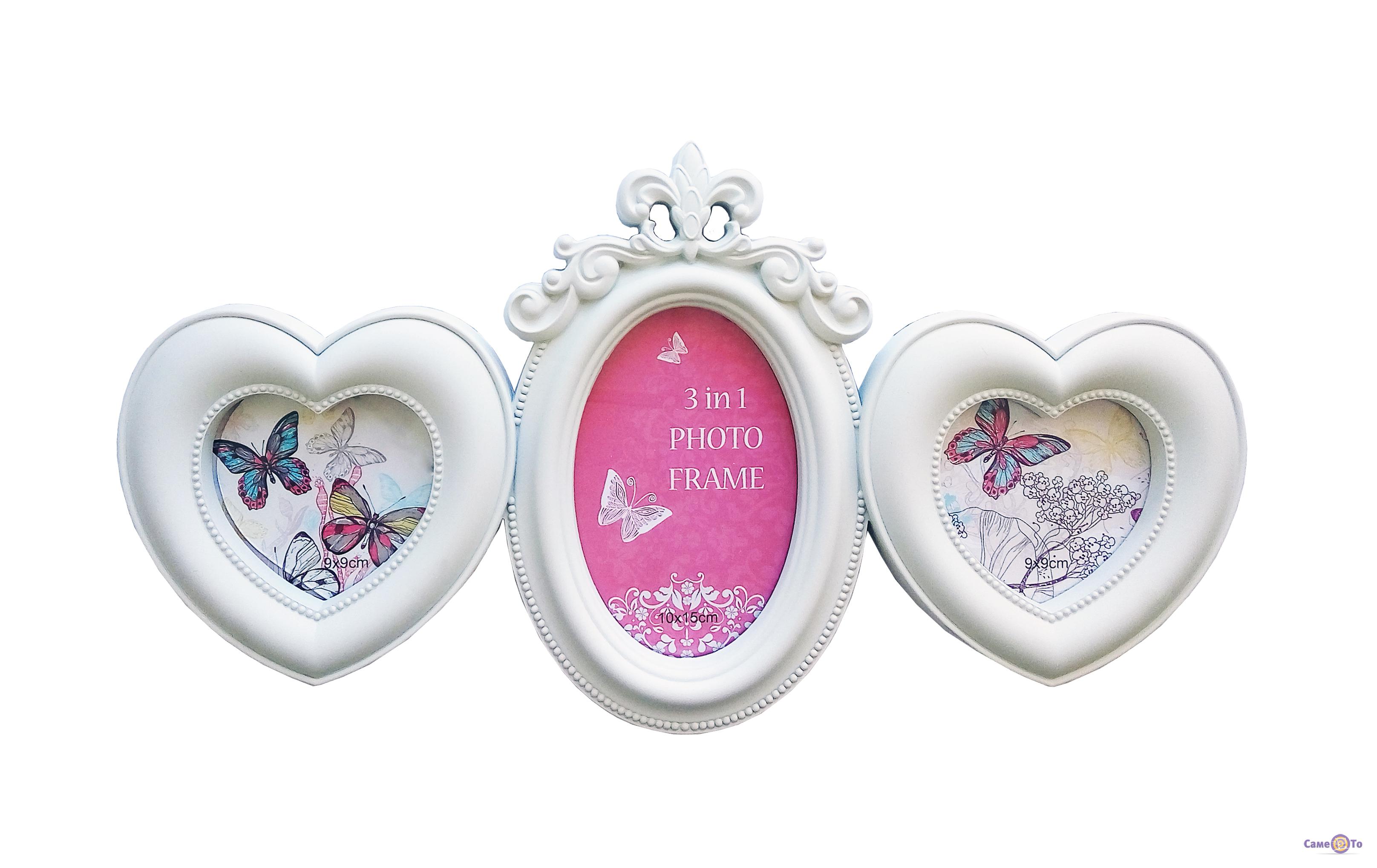 У нашому інтернет-магазині Ви можете купити витончену й елегантну мультирамку на три фотографії. Вона має надзвичайно ніжний зовнішній вигляд, тому що складається з трьох секцій - всередині розташований овал, а з боків два однакових серця. Відповідно, і знімки будуть мати таку саму форму. Висота мультірамкі становить 23 см, а ширина - 43 см. Розміри фото - 10 х 15 см (1 шт.), 9 х 9 см (2 шт.). Мультирамка виконана з міцного пластику високої якості і має універсальний кремовий колір, який органічно впишеться в інтер'єр будь-якого приміщення. Якщо Ви ще не знаєте, який подарунок вибрати коханому, подрузі або батькам на річницю весілля, обов'язково зупиніться на даній мультирамці, адже вона гарантовано сподобається кожному!