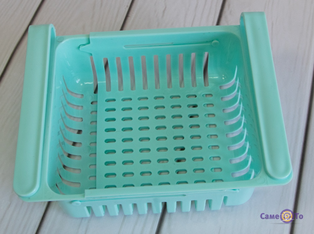Підвісний органайзер для холодильника зроблений з харчового пластику, стійкого до впливу низьких температур. Це невеликий ящичок розміром 14.5x12x5 см., зі зручною ручкою і спеціальними «полозами», завдяки яким він легко і надійно кріпиться до полиці. Ящик встановлюється і знімається одним рухом. Не вбирає рідину, тому на ньому не залишиться плям від соку фруктів, шоколаду, молока або розбитих яєць. При забрудненні досить зняти і обполоснути ящик під водою. Можна використовувати миючий засіб.