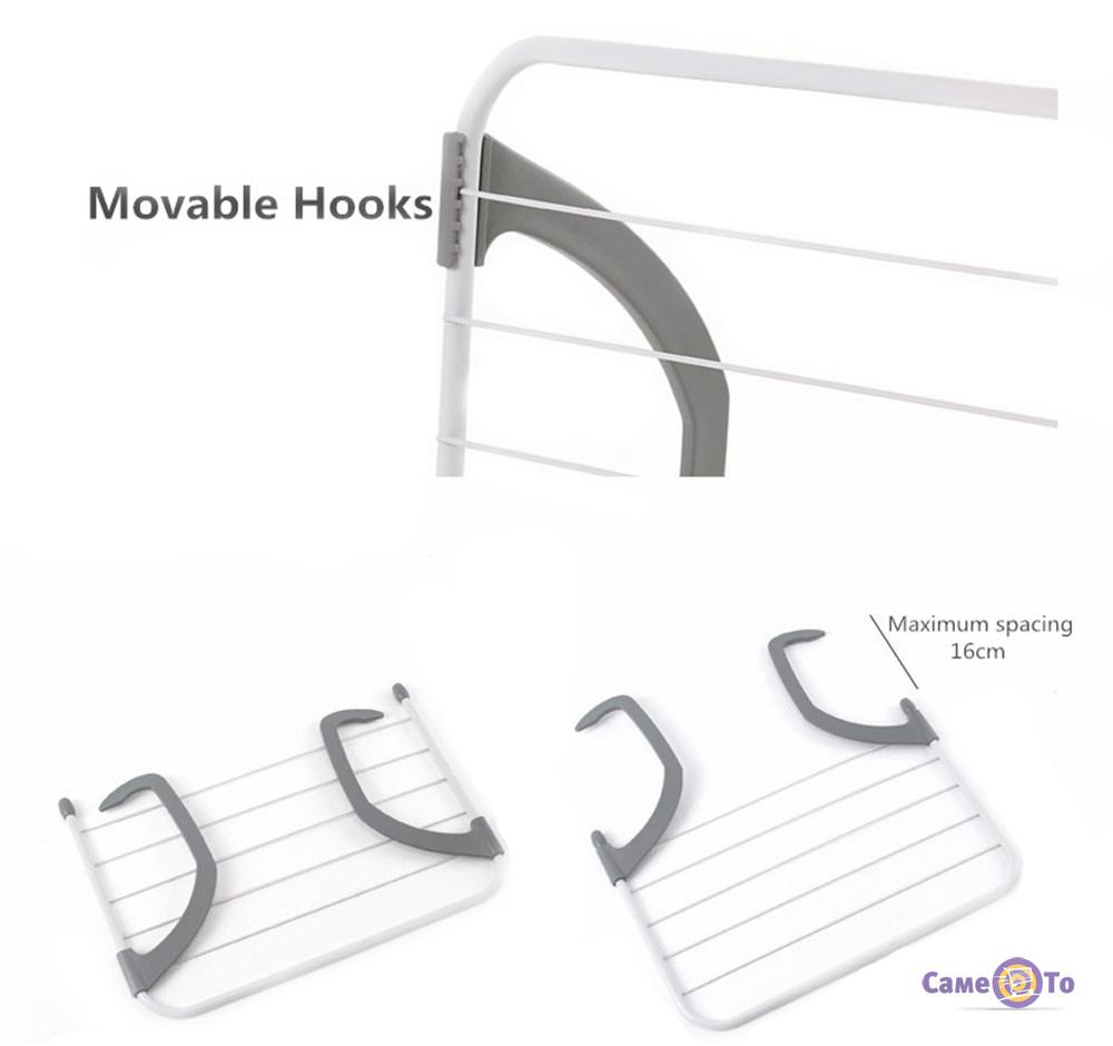 Складна сушарка прикріплюється до радіатора будь-якого типу за допомогою спеціальних гачків. Вона легко встановлюється і знімається. Незважаючи на досить компактні розміри, Ви зможете розмістити на ній більшу кількість вещей꞉