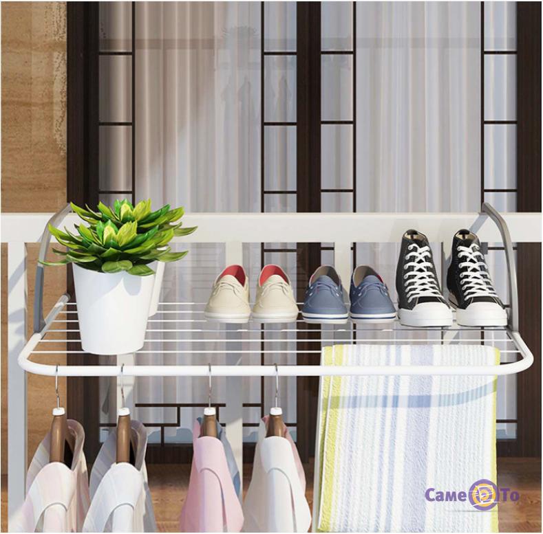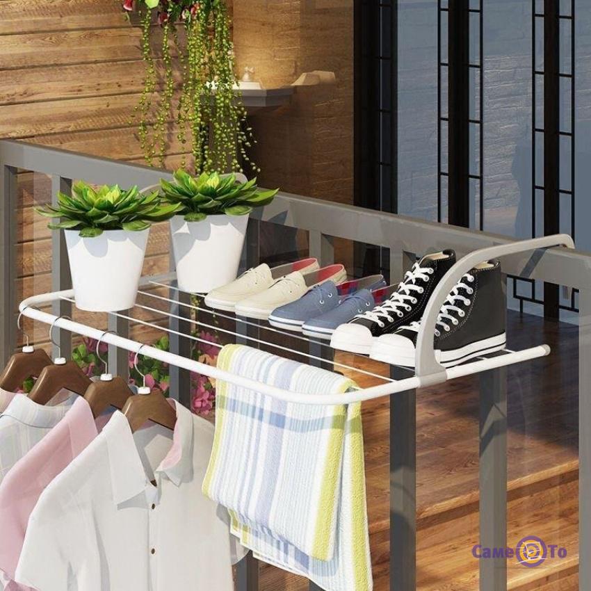 У спекотну пору року можна використовувати складну сушарку для речей і взуття для сушіння на відкритому повітрі. Для цього достатньо буде просто прикріпити її до поручнів балкона або підвіконня. І Ви позбудетеся від необхідності протягувати через весь балкон мотузки і тягнутися, або вставати на стілець, щоб повісити на них речі, а потім зняти їх.