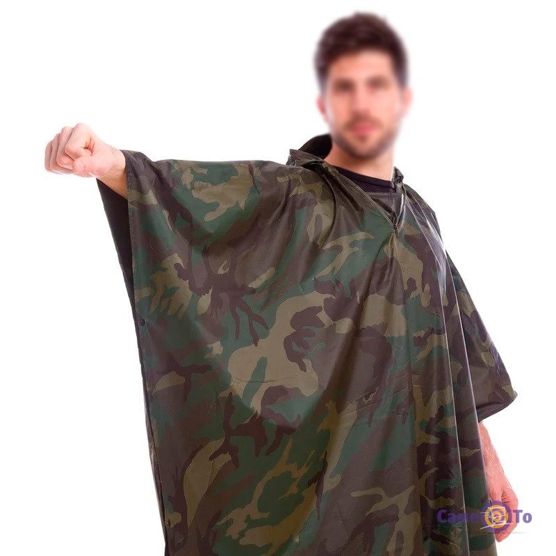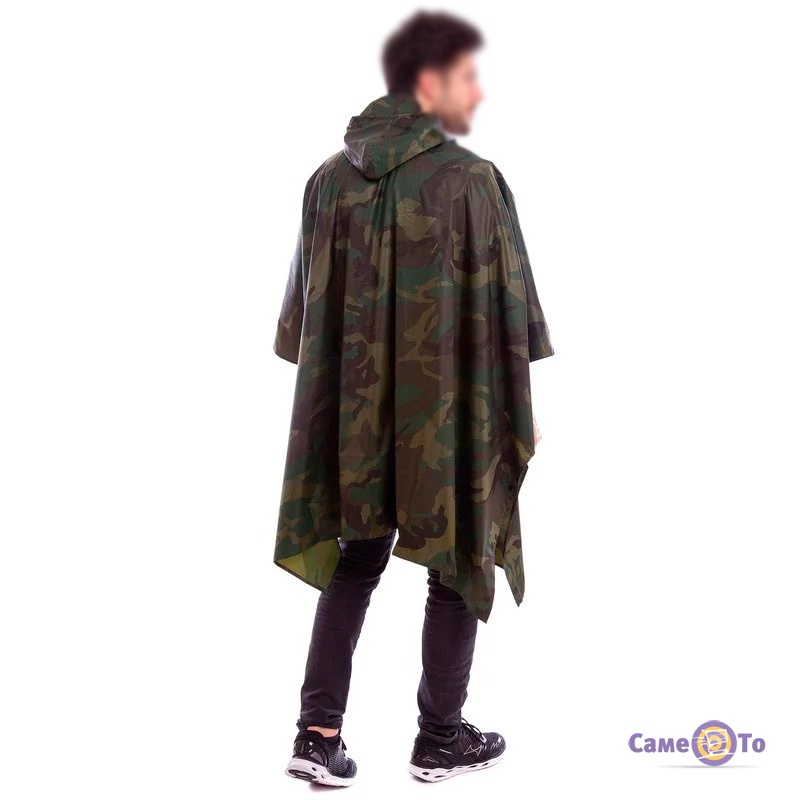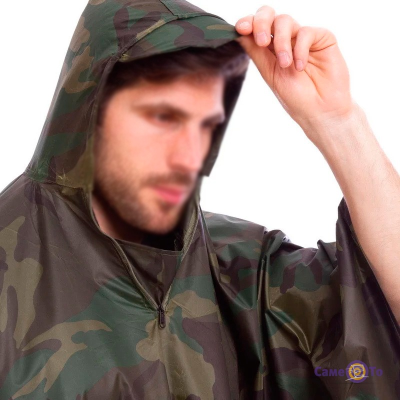 У комплект дощовика входить не тільки плащ з капюшоном з захистом від дощу, але і зручний чохол на блискавки, призначений для зручності зберігання і транспортування дощовика. Зручно, що капюшон має довгий міцний козирок, повністю захищає людину від попадання крапель в очі. Маскуючмй колір оливкового камуфляжу дозволяє не привертати зайву увагу, а універсальний дизайн підходить як для жінок, так і для чоловіків. Примітно, що, прикріплюючи між собою кілька пончо, їх можна з'єднати в одну велику палатку, що дуже зручно, якщо погана погода наздоганяє на природі вдалині від укриття.