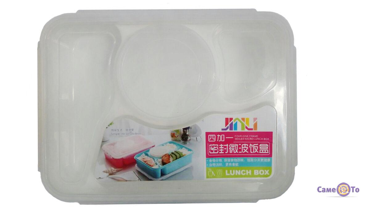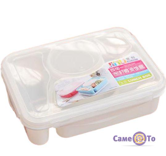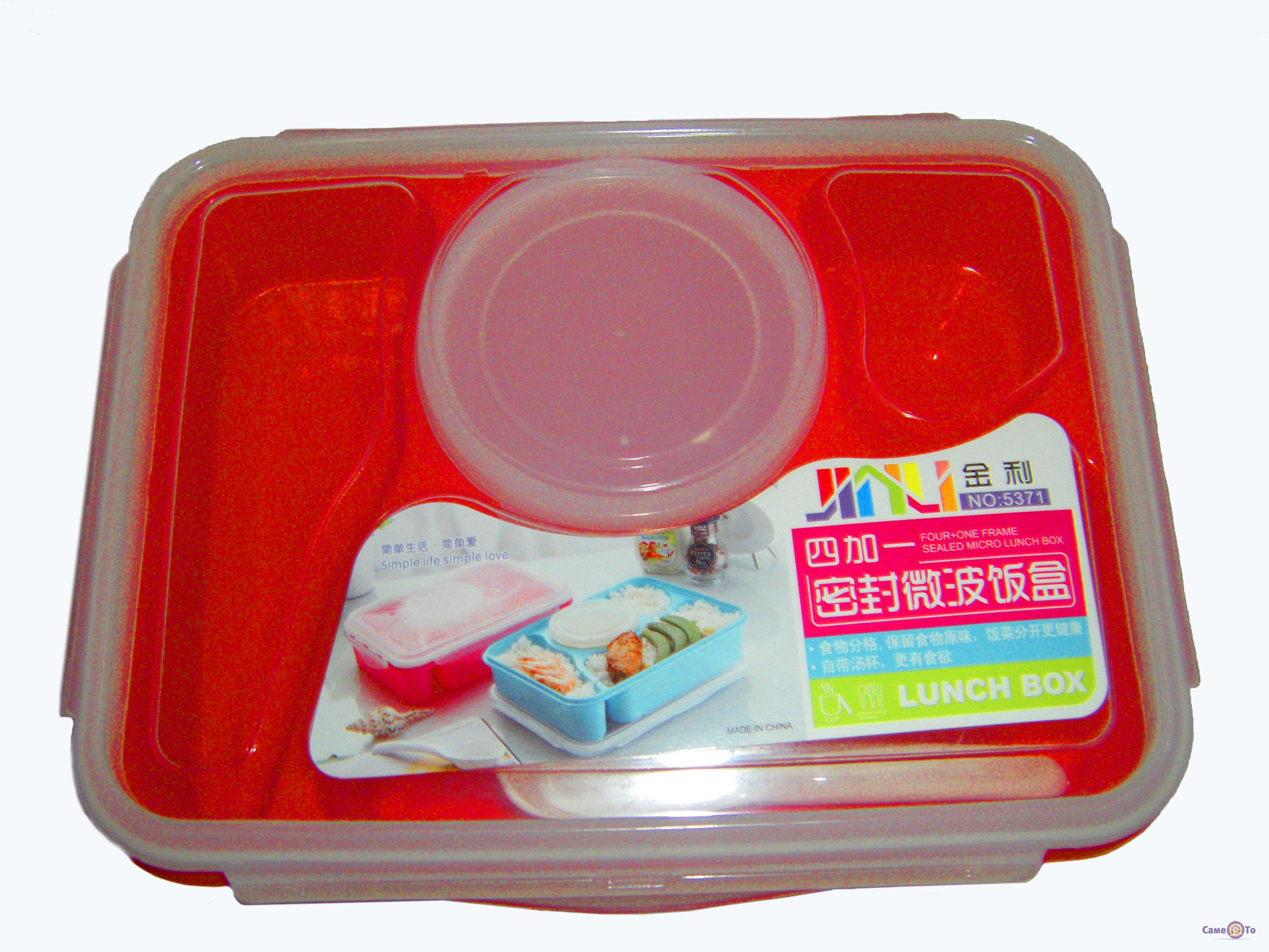 Контейнер оснащений пластиковою кришкою, яка щільно закривається на засувки. Відділення, призначене для зберігання рідини, закривається ще однією додатковою кришкою, так що проливання повністю виключається. Всього в судочку чотири відділення, різних за розмірами і формою. Одне відділення відмінно підходить для зберігання столових приладів. Але його можна використовувати і в якості ємності для продуктів.