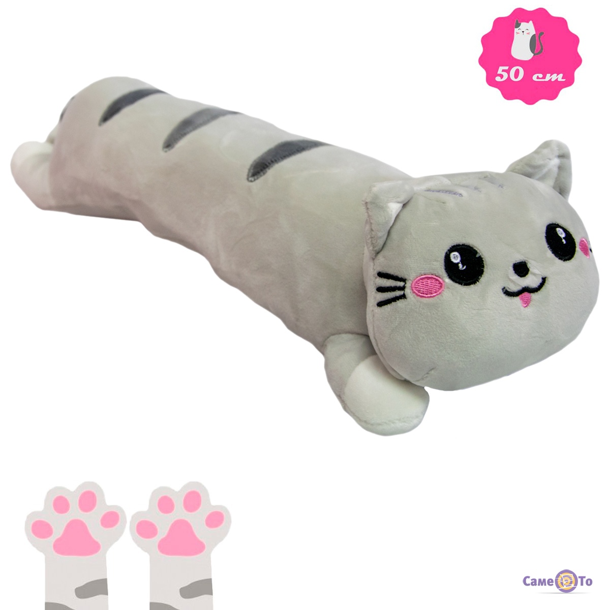 Далеко не все игрушки мягкие можно корректировать по количеству набивки, но подушка котик имеет специальную молнию, благодаря которой вы сможете как убрать наполнитель, если плюшевая игрушка покажется вам слишком жесткой, так и добавить его, если она будет для вас очень мягкой. Перед вами большая мягкая игрушка, ее длина составляет 50 см с хвостиком. Но самое главное – это цена, стоит такой кот подушка вовсе недорого.