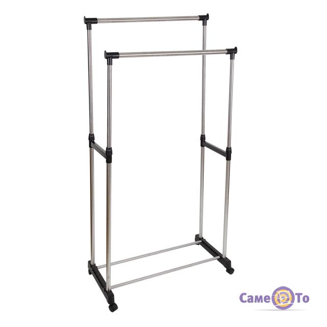 Подвійна телескопічна стійка для одягу збирається з міцних металевих трубок. Трубки всередині порожнисті, для полегшення ваги конструкції. Вони витримують досить велику вагу (на стійку можна розмістити до 30 кг. вантажу).