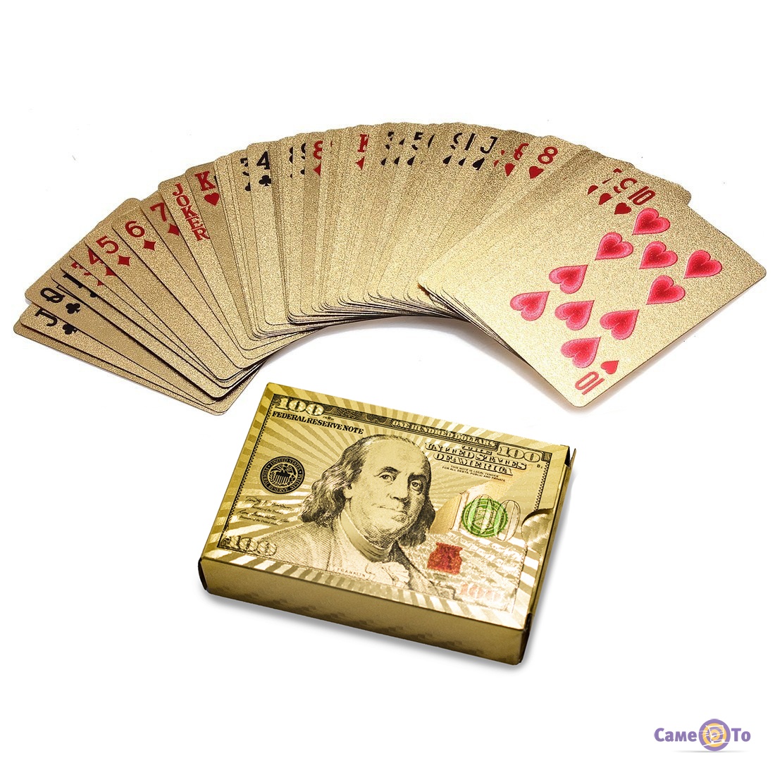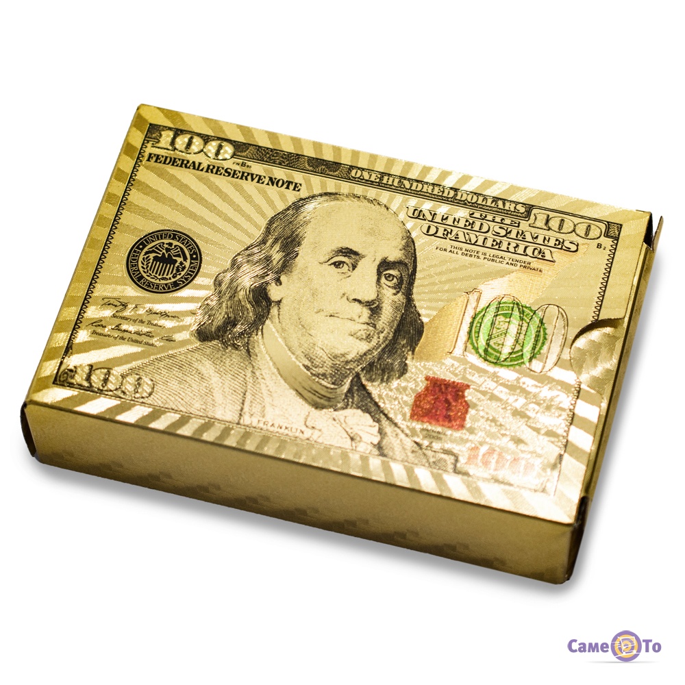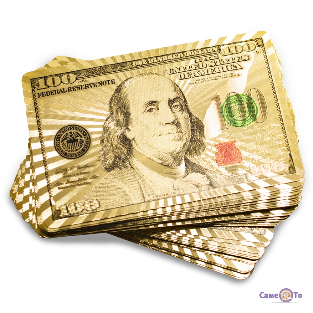 Золоті гральні карти мають малюнок у вигляді долара на зворотньому боці карт.