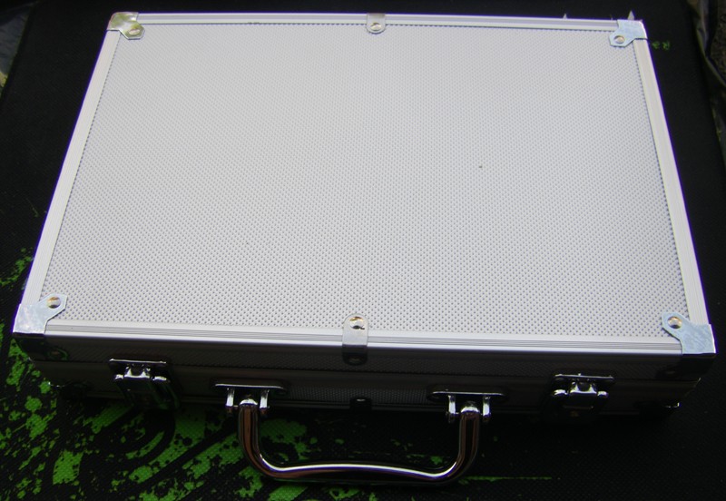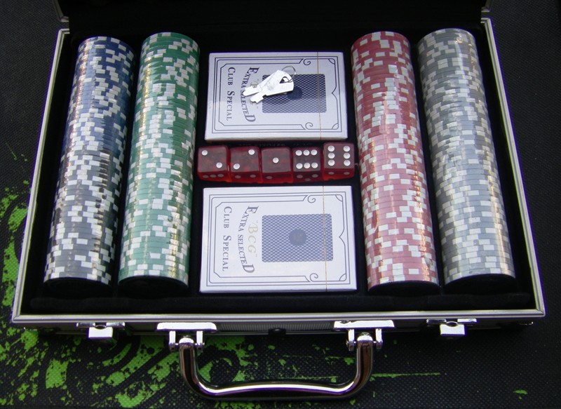 Комплектуючі: - металевий кейс (алюміній); - фішки (200 шт), - карти (2 колоди); - гральні кістки. |