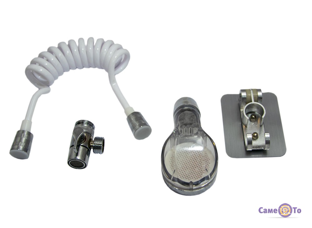 Даний комплект складається з ручної насадки для душа, з клапана, який перемикає потоки води, шланга і утримувача насадки для душа. Дана душова система дозволяє відмінно вимити волосся або помити домашніх тварин. Душовий комплект виготовлений з нержавіючого металу, а значить, довго прослужить у вживанні. Не потрібно використовувати гвинти або свердлити стіну, щоб встановити цю систему. Єдиним обмеженням є установка комплекту на дзеркало або скляну поверхню.