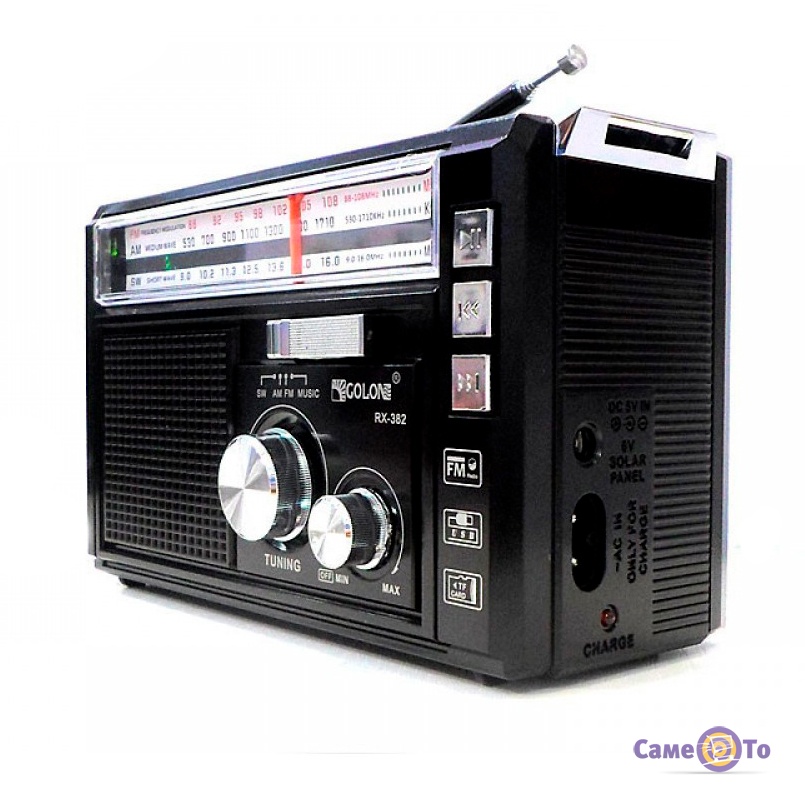 Пропонуємо до вашої уваги не просто радіоприймач фм. Дана модель "Golon RX-382" - це фм радіоприймач з вбудованим ліхтариком та акумулятором. Він гарантовано порадує вас якістю відтворення музики та кількістю знайдених хвиль. Радіоприймач здатний шукати станції у трьох діапазонах – FM, AM, SW. Ця модель також може використовуватися як портативна колонка, тому що відтворює аудіофайли у форматі МР3, підключаючись до інших приладів за допомогою роз'ємів USB, TF.