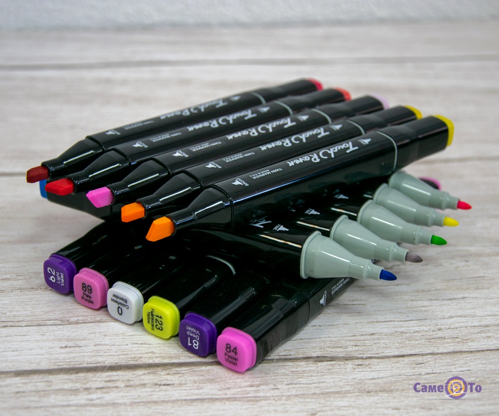 Маркери для малювання - це спеціальні спиртові маркери, які використовуються для створення малюнків або проведення каліграфічних написів, для створення коміксів або живописних ескізів. Зроблені двосторонні маркери в пластиковому якісному корпусі, на краях мають щільні ковпачки. Кожен край маркера розфарбований своїм кольором для простоти використання. Крім того, всі кольори мають свій цифровий код, який нанесений на ковпачок водостійкого маркер. Професійні фломастерів для малювання мають чорнило, які добре всмоктуються в папір. Підходять більше для щільних аркушів або для картону. При нанесенні малюнка відображають плавний перехід кольорів і ліній. У наборі йде 120 кольорів. Кожен з яких відноситься до одного маркера. Продаються фломастери художні в спеціальному чохлі, в якому їх завжди зручно зберігати.
